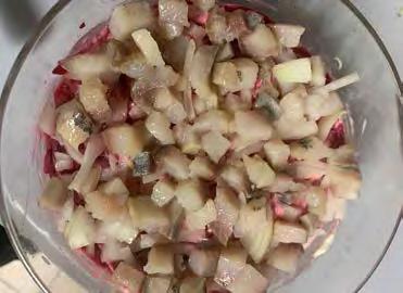 3. Лук также порезать мелким кубиком и перемешать с селедкой.