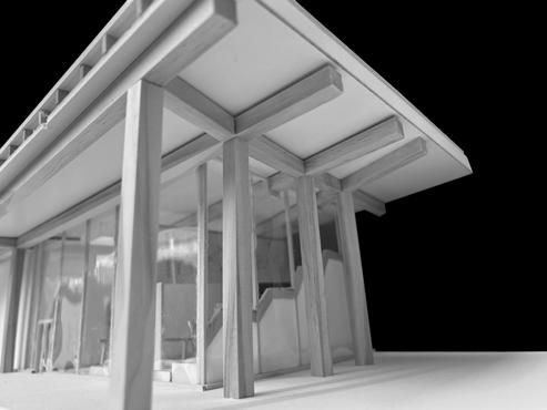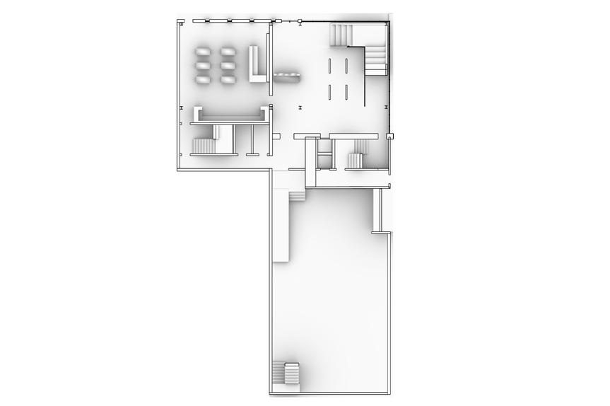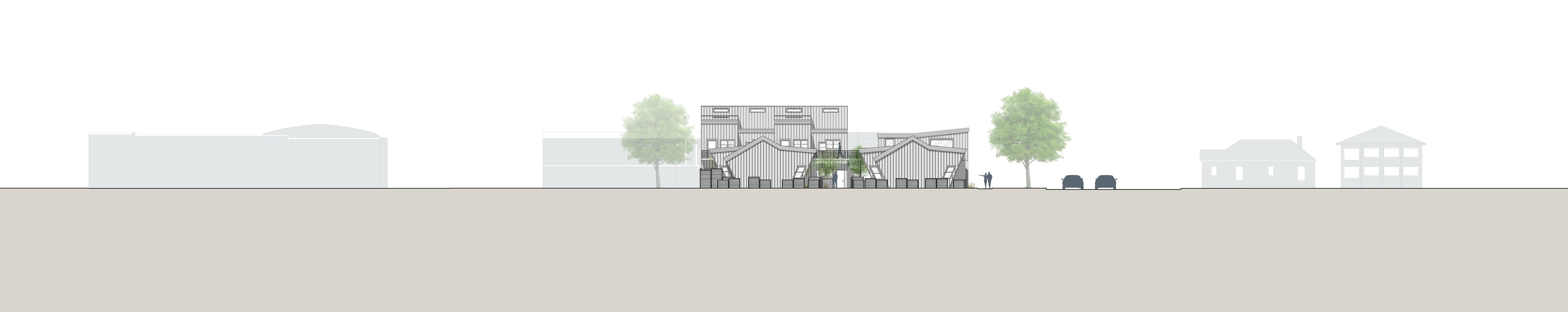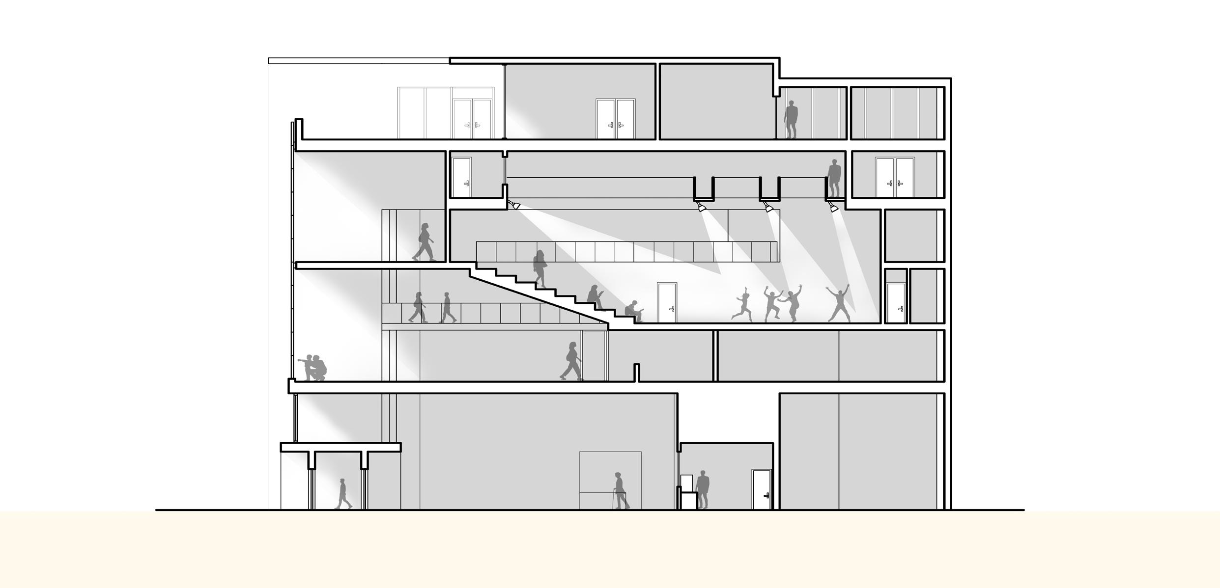 Elevating the black box theater creates a welcoming ground level, opening the space for entry and seamless public interaction.