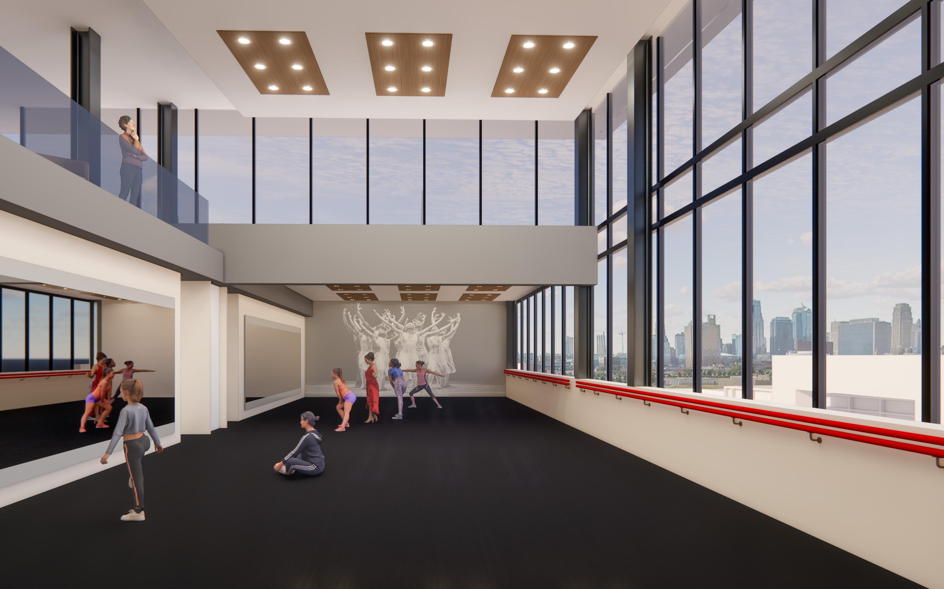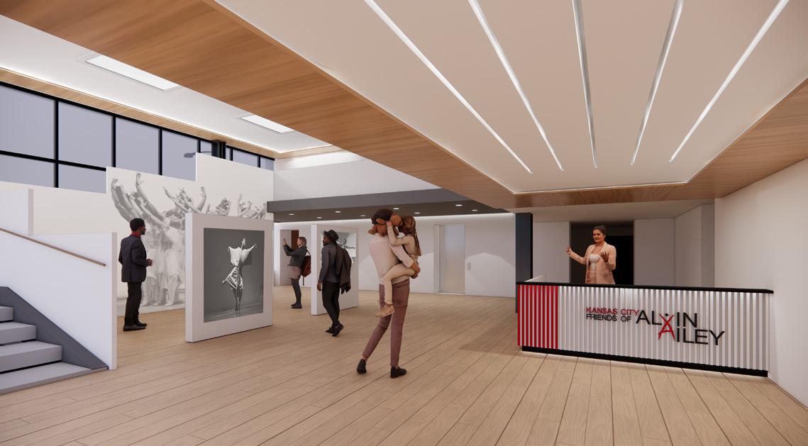 Separating the KCFAA program into distinct spaces—placing the dance studio above and the administration, lobby, and gallery below—creates a vertical hierarchy. This organization reflects Alvin Ailey’s choreography, where each element plays a unique yet interconnected role.