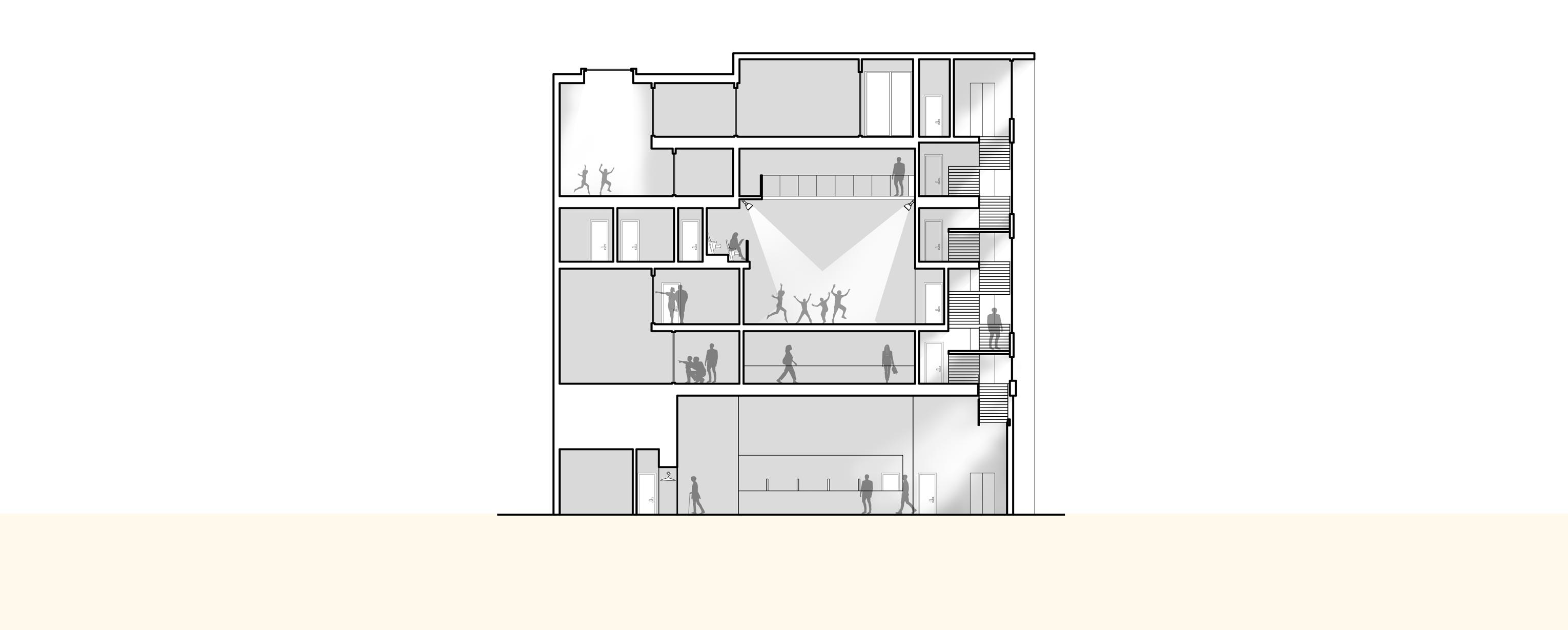 Dividing the KCFAA and residential programs ensures that each serves its patrons independently, creating a clear separation. This distinction also introduces a dynamic contrast within the building, echoing the harmonious interplay of opposites in Alvin Ailey’s choreography.