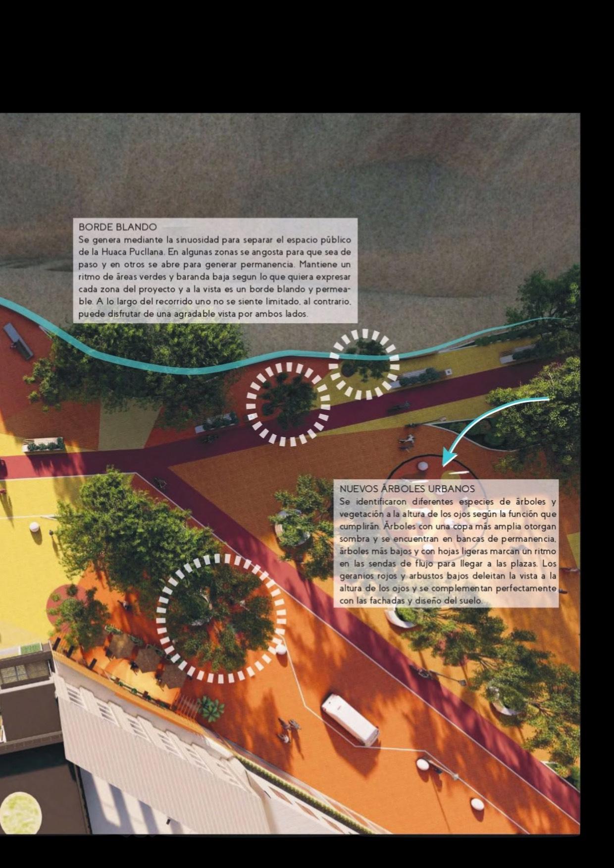 Proseguimos con la propuesta, en la cual aplicamos todo lo mencionado anteriormente per además, incluimos teoría ya vista en cursos anteriores como Urbanismo 1 y Urbanismo 2. Presentamos una propuesta de mobiliario, tratamiento de suelo, paisajista, de estructura vial y de flujos. Nuestra propuesta se ubica en el distrito de Miraflores, exactamente en los alrededores de la Huaca Pucllana, consideramos que esta era una zona en donde faltaba potenciar la idea de este lugar turístico tan famoso como lo es la Huaca, incorporamos mobiliario atractivo pero a la vez útil para los peatones, que no sea un adorno en la calle que se quede en el abandono, también rutas alternativas para un tráfico calmado y por último edificios de usos mixtos que puedan mantener la zona vigilada de día y de noche. Queremos recuperar el espacio público para devolverle algo que durante años se le ha quitado al peatón.