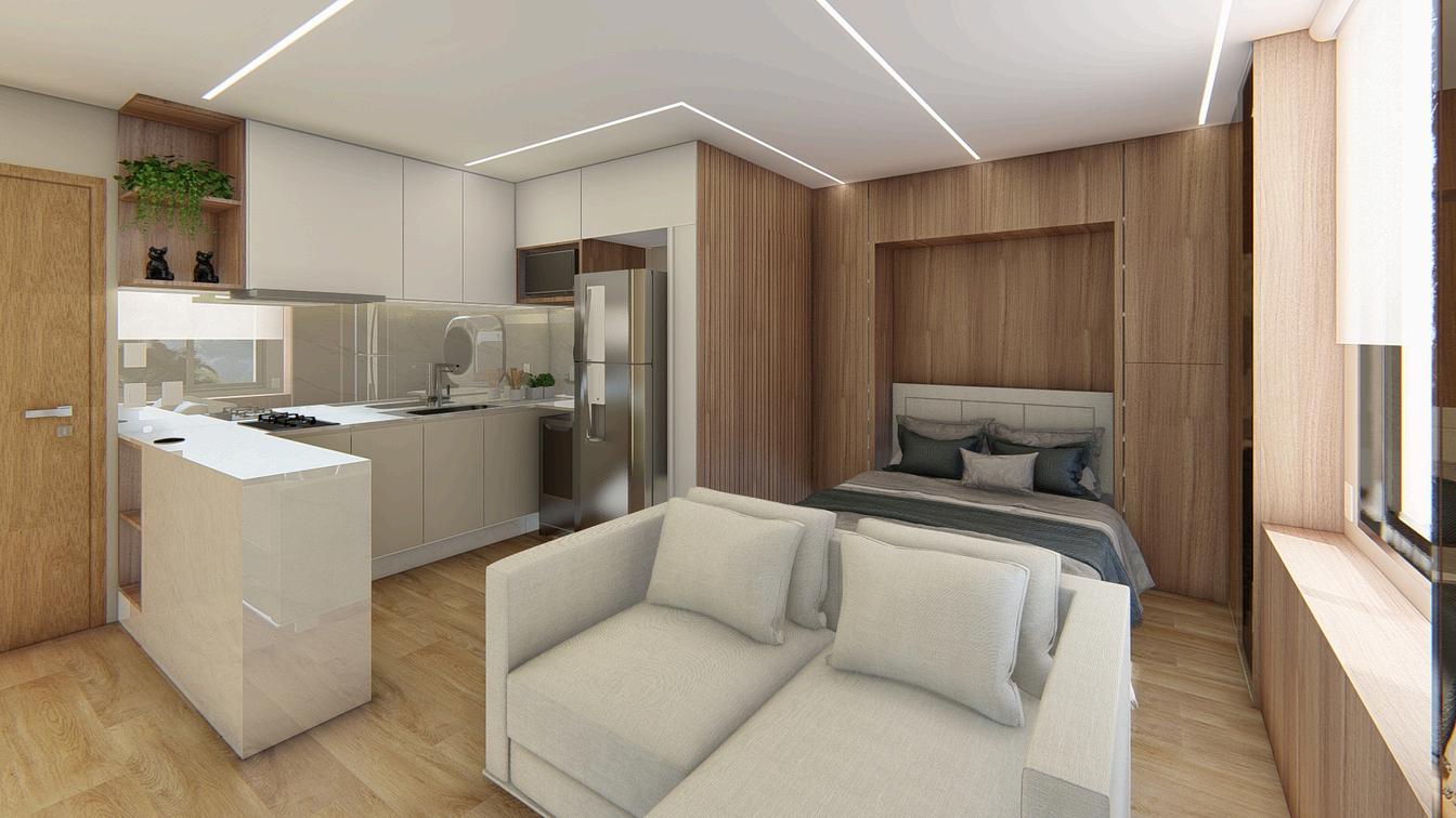 O Studio 621 é um apartamento de apenas 22 m² que ofereceu muitos desafios e aprendizados. Comportar todos os ambientes essenciais ao dia a dia trazendo elegância e funcionalidade foi o cerne deste projeto. Assim, o estudo da marcenaria e o detalhamento complexo foi primordial para que a cama se encaixasse perfeitamente no guarda roupas para assim surgir a mesa de jantar. Outra modelagem de suma importância para a estética deste projeto foi a porta mimetizada que da acesso ao banheiro, sendo que esta ao estar fechada se encaixa ao painel ripado, trazendo harmonia ao ambiente.