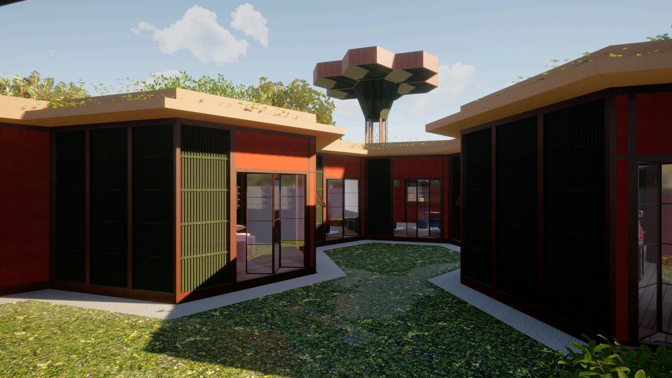 A Escola Modelo Eu Rural é o resultado de 12 meses de intensa pesquisa e trabalho, marcados pelo desejo de redescoberta e conexão com o meio rural. Seu projeto é modular e vernacular, utilizando painéis de taipa de mão e bambu, técnicas tradicionais dominadas pelos moradores locais. A volumetria hexagonal facilita o encaixe entre os módulos, com base em um sistema construtivo inspirado no padrão wood frame. Além disso, o teto verde, a revitalização da quadra e o acesso no nível inferior proporcionam uma experiência lúdica e cheia de descobertas para as crianças.