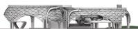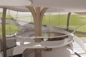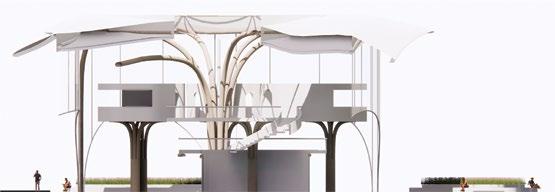 The final system incorporates the tree-column with a ring acting as structural support, and a tube that connects the concave glass roof to the water collection system.