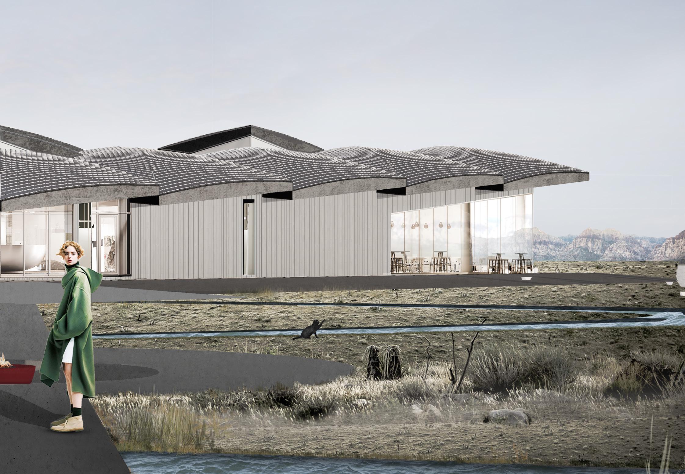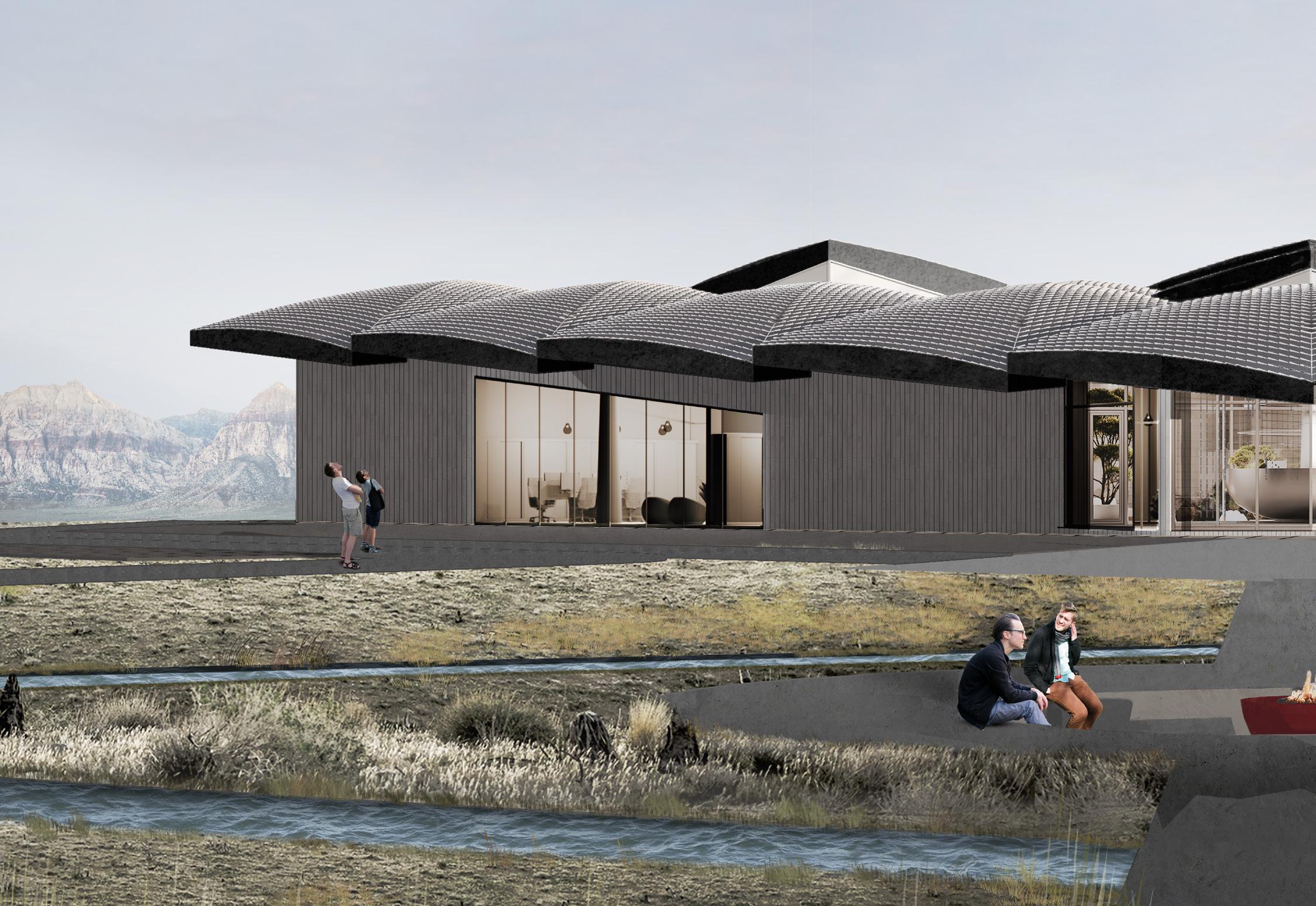 Sinusoid shape river with an amplitude in strict proportions of the golden ratio is pierced by a wide promenade over the water surface, which leads to the farthest corner of the site. The outdoor fire pit seating is located on this axis of the promenade which serves as an alternative public event area.
