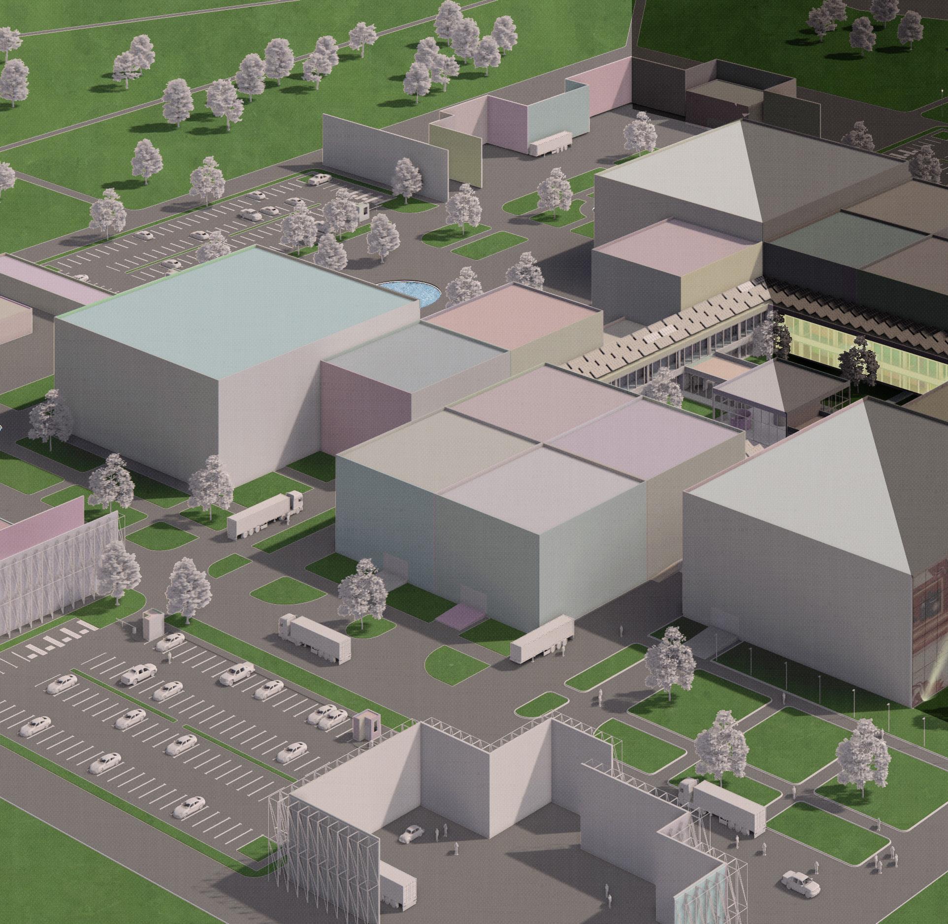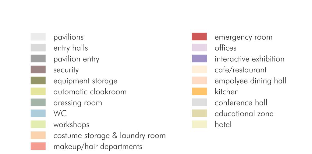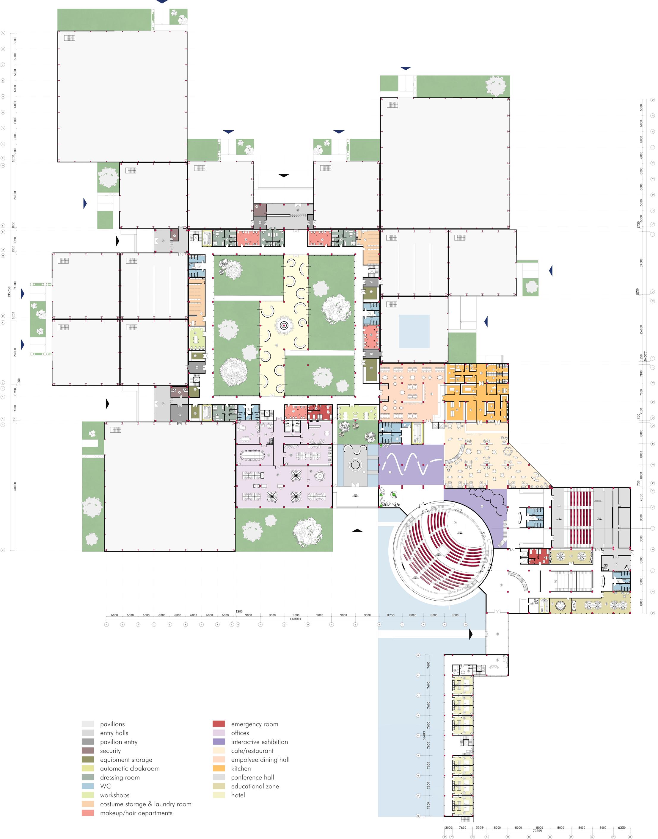 The center is meant to combine every single process needed for producing a film in one place, started from the pre-production to the first screening and premiere. The center is divided into public (guest areas – a restaurant, museum and cinemas) and private (production) zones. It includes several pavilions which can be used for both filming and storage, workshops for props creation, post-production offices, a small hotel, dressing rooms, recreation zone etc.