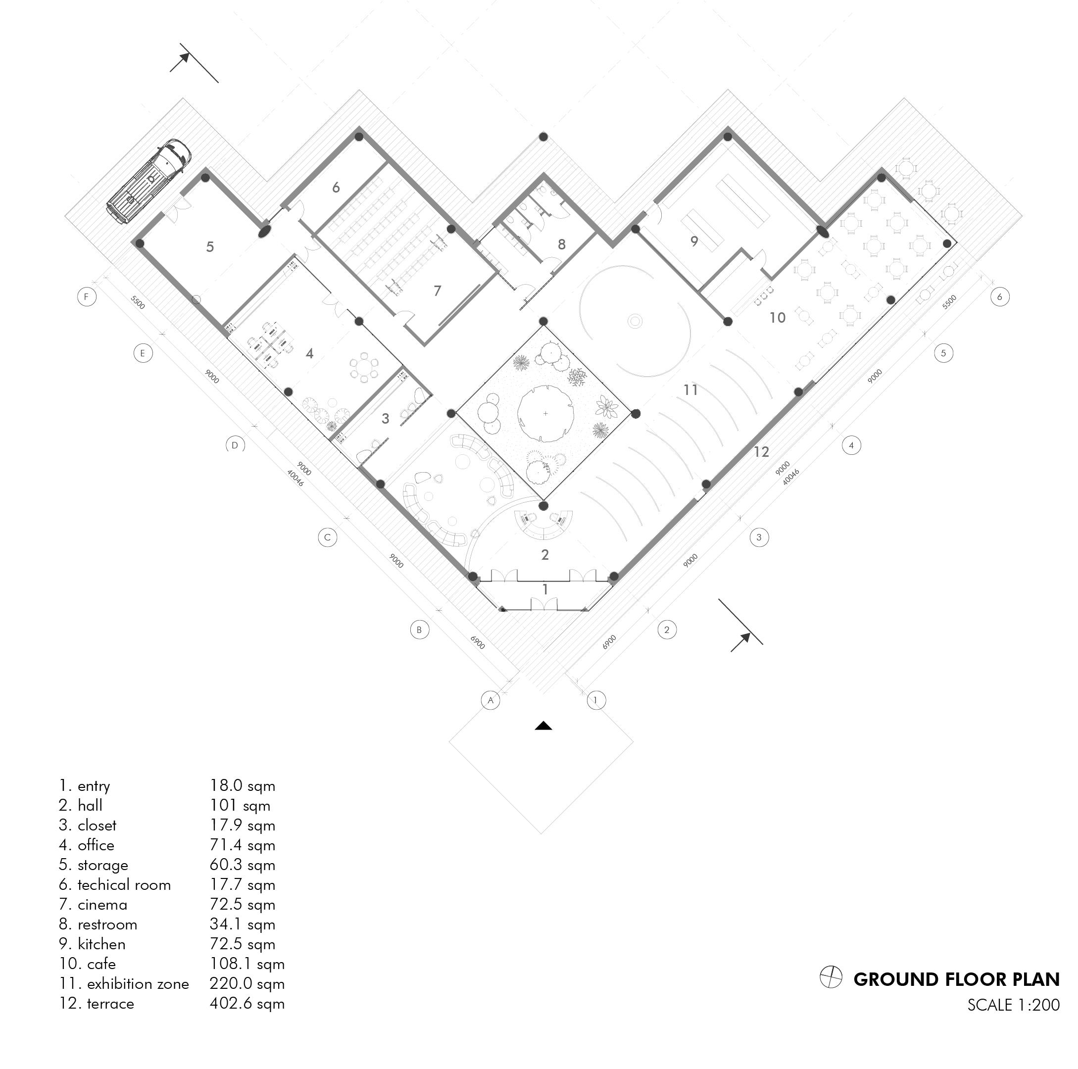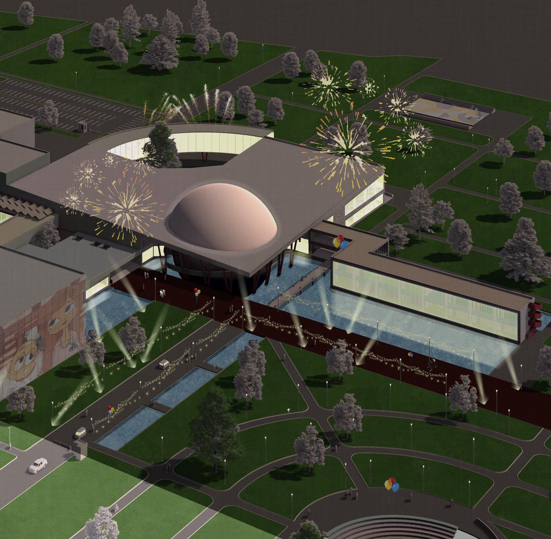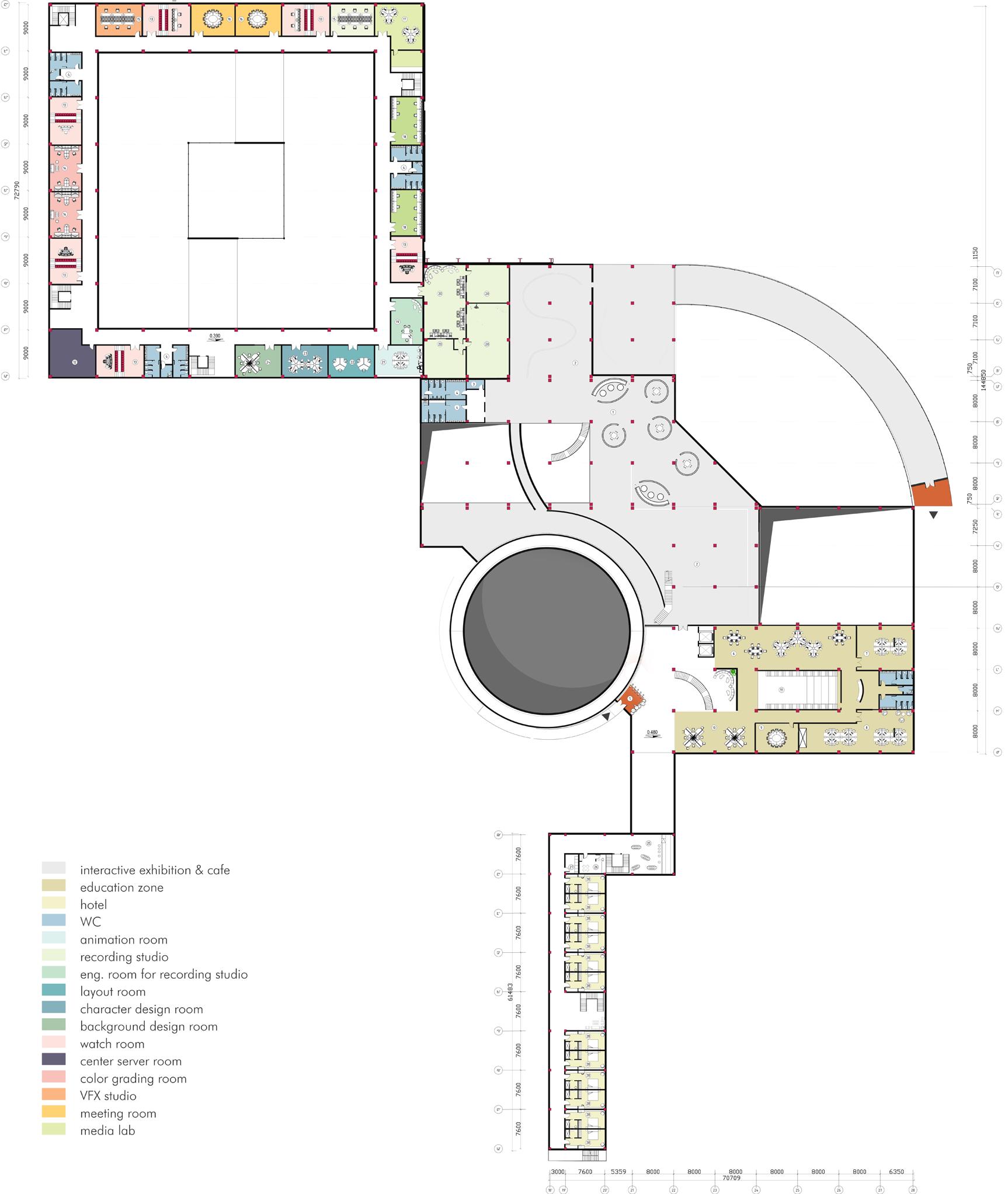 The center is meant to combine every single process needed for producing a film in one place, started from the pre-production to the first screening and premiere. The center is divided into public (guest areas – a restaurant, museum and cinemas) and private (production) zones. It includes several pavilions which can be used for both filming and storage, workshops for props creation, post-production offices, a small hotel, dressing rooms, recreation zone etc.