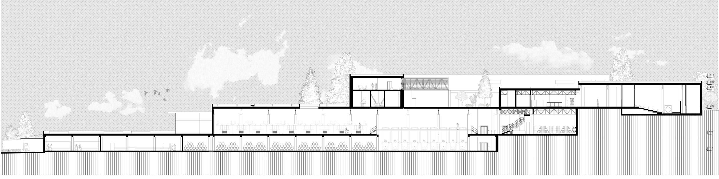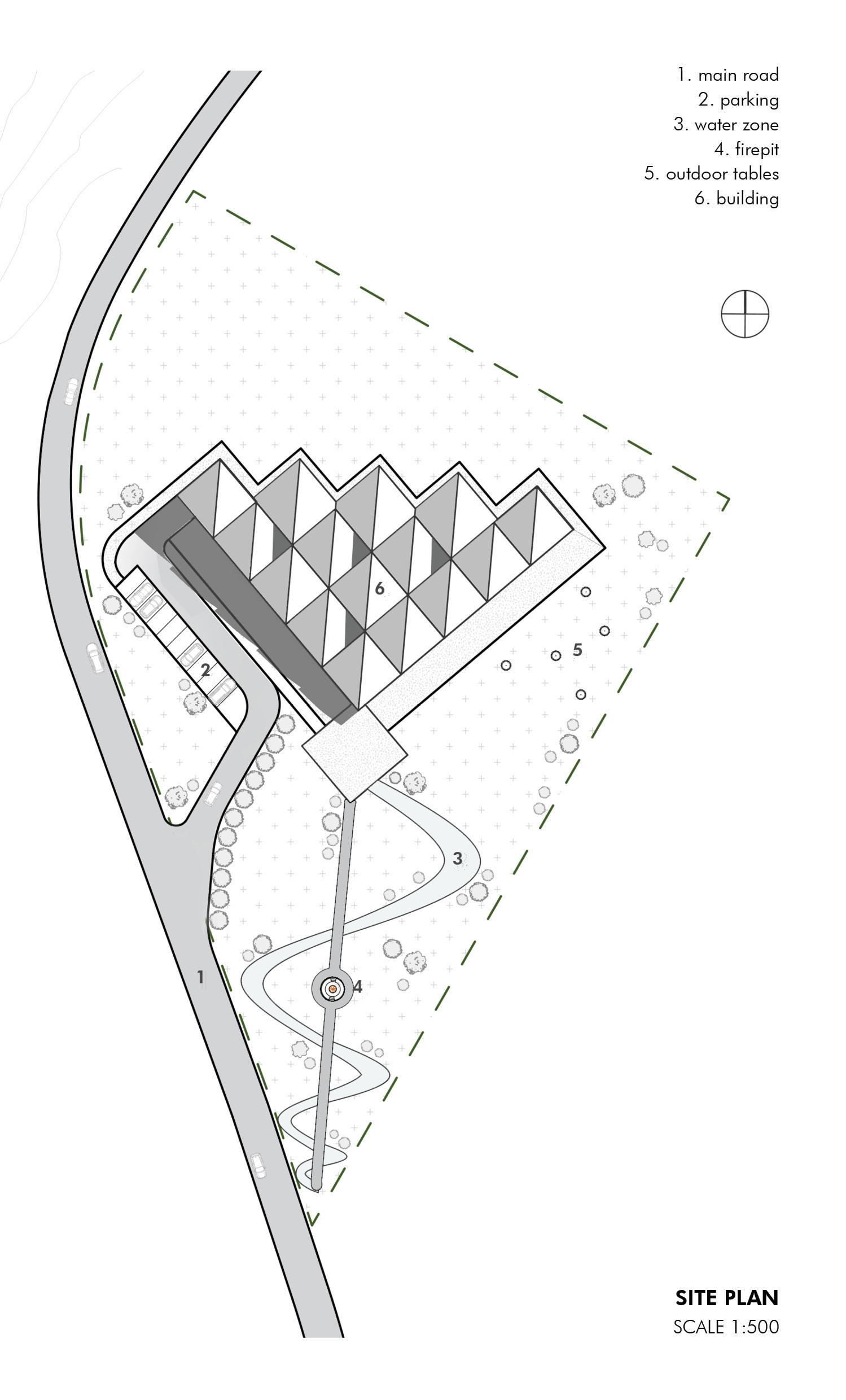 The building is located in the north of the site. Thanks to this solution, it is possible to organize a spacious area from the south, with beautiful panoramic views and outdoor activities, music, drinks and outdoor sitting by the fire.