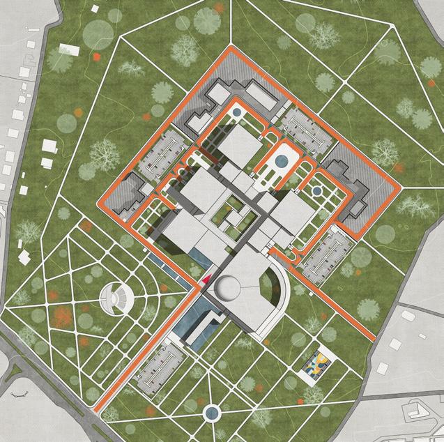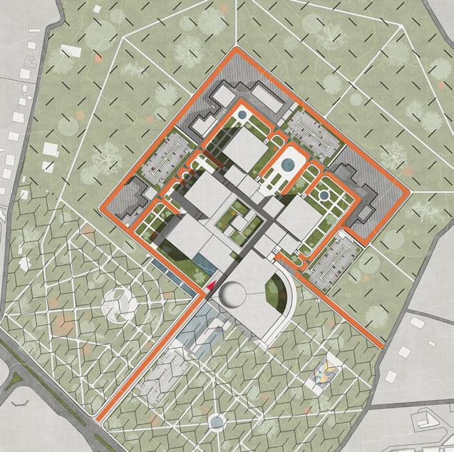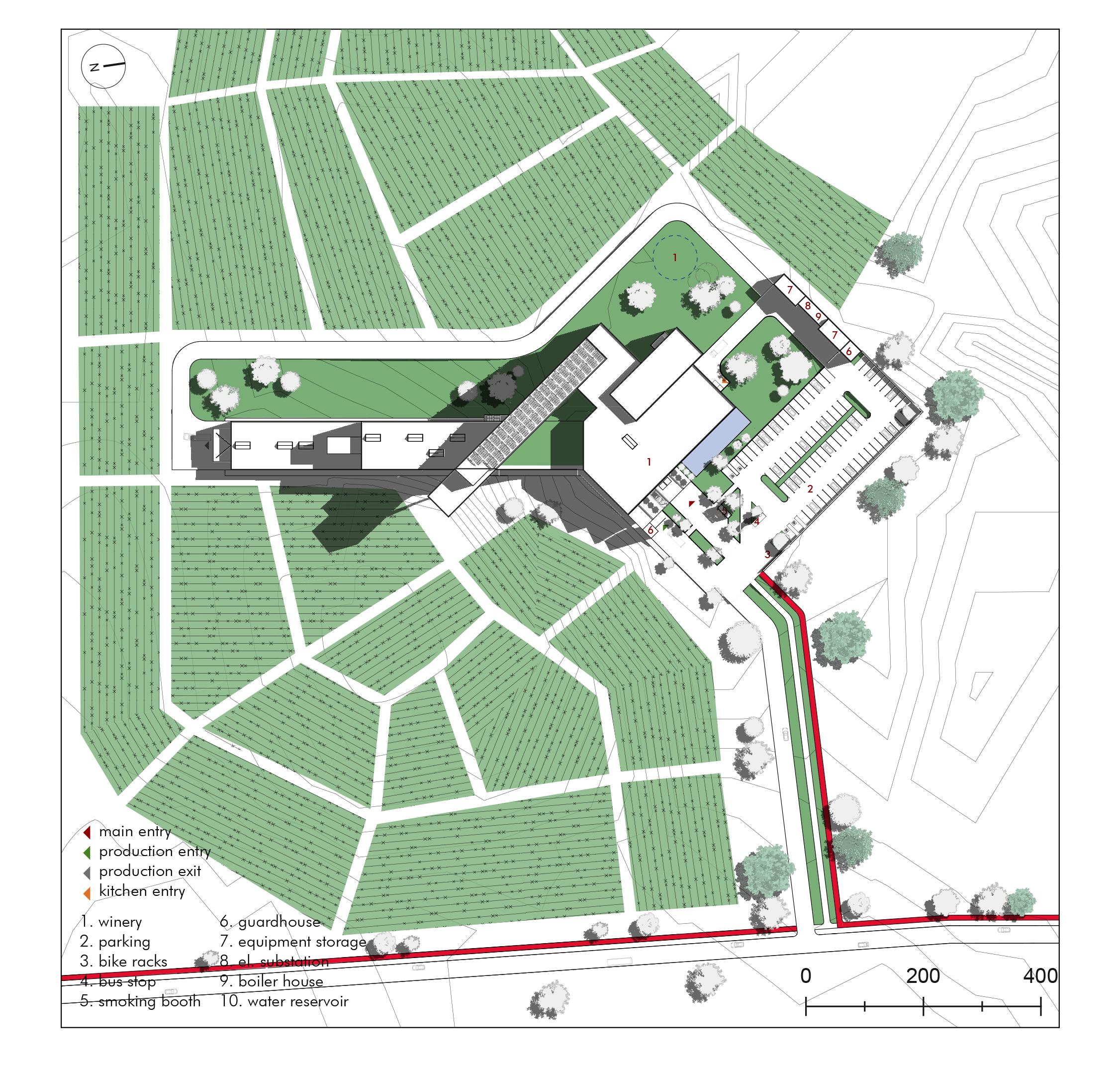The diagram on the right illustrates the navigationto the building complex. There is one main road which splits into several smaller ones inside the production zone. Each pavilion gets a separate vehicle access to its gate.