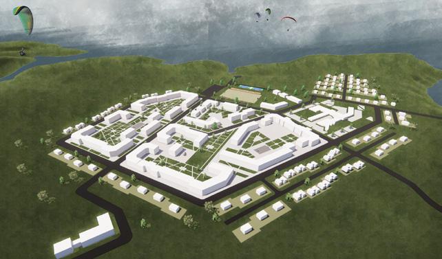 Square blocks are connected to each other in a large triangle, in the form of a soaring bird, or the mythical Icelandic dragon. The proposed solution consists of 15 modules, 9x9 meters of each.