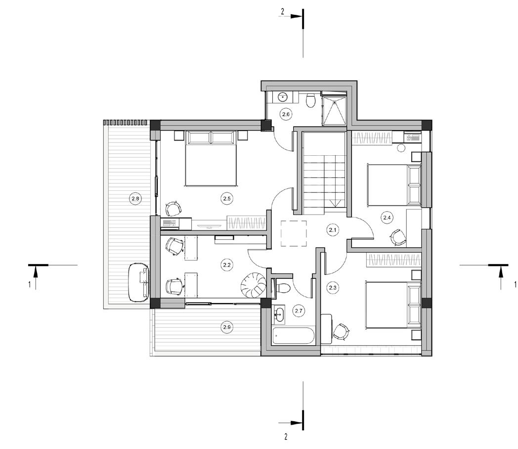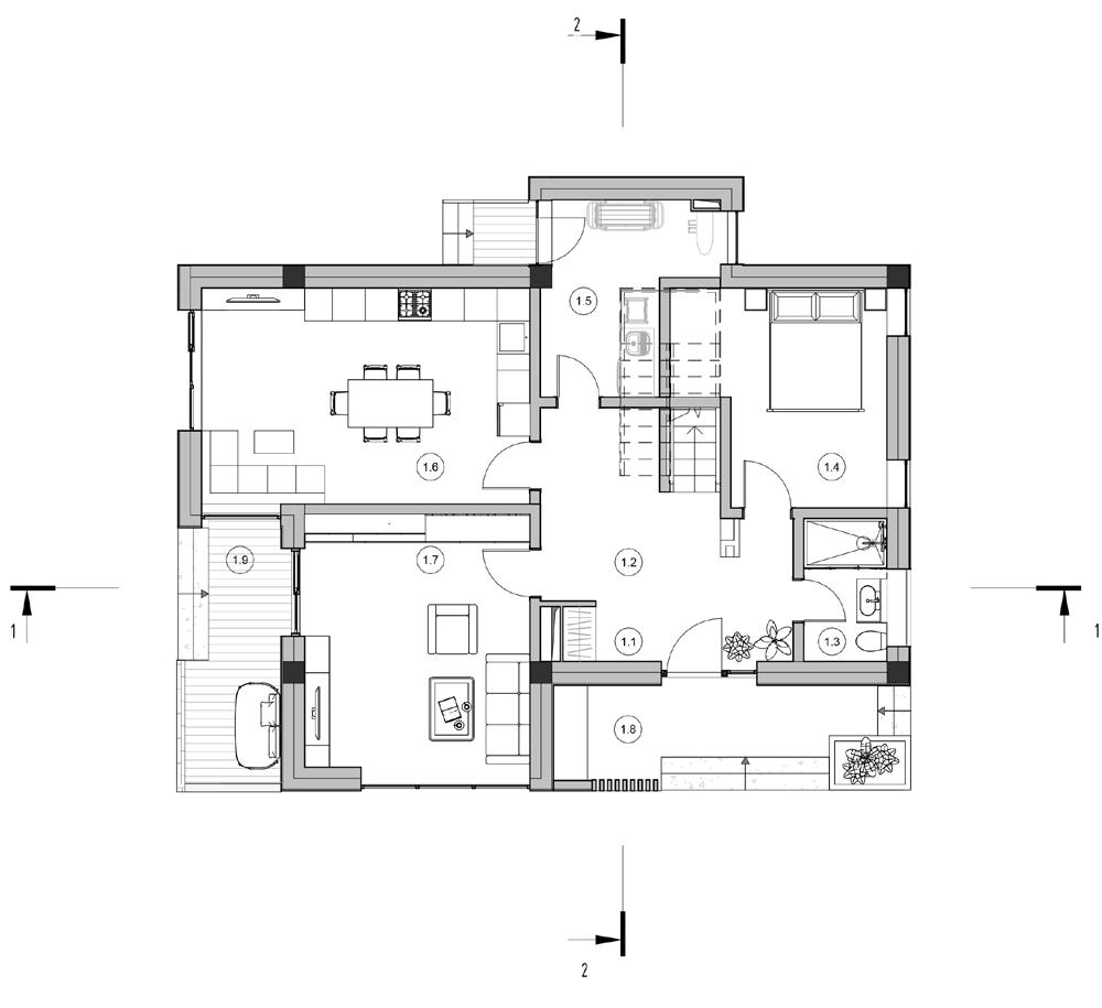 The ground floor consists of living zones – kitchen, living-room, laundry room, a bathroom and one guest bedroom. The entrance is from the southeast side which is semi-enclosed area, protected from precipitation. The laundry room, located right under the staircase, has an access to backyard. Panoramic windows and doors opening from the living room and kitchen provide access to the outdoor summer terrace. Versatile orientation allows to have a natural ventilation and lighting, as well as views to all parts of the garden.