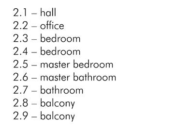 The second floor features two bedrooms, including a master bedroom with its bathroom, one additional bathroom, and an office. Additionally, there are two balconies, one accessible through the office and the other belonging to the master bedroom.