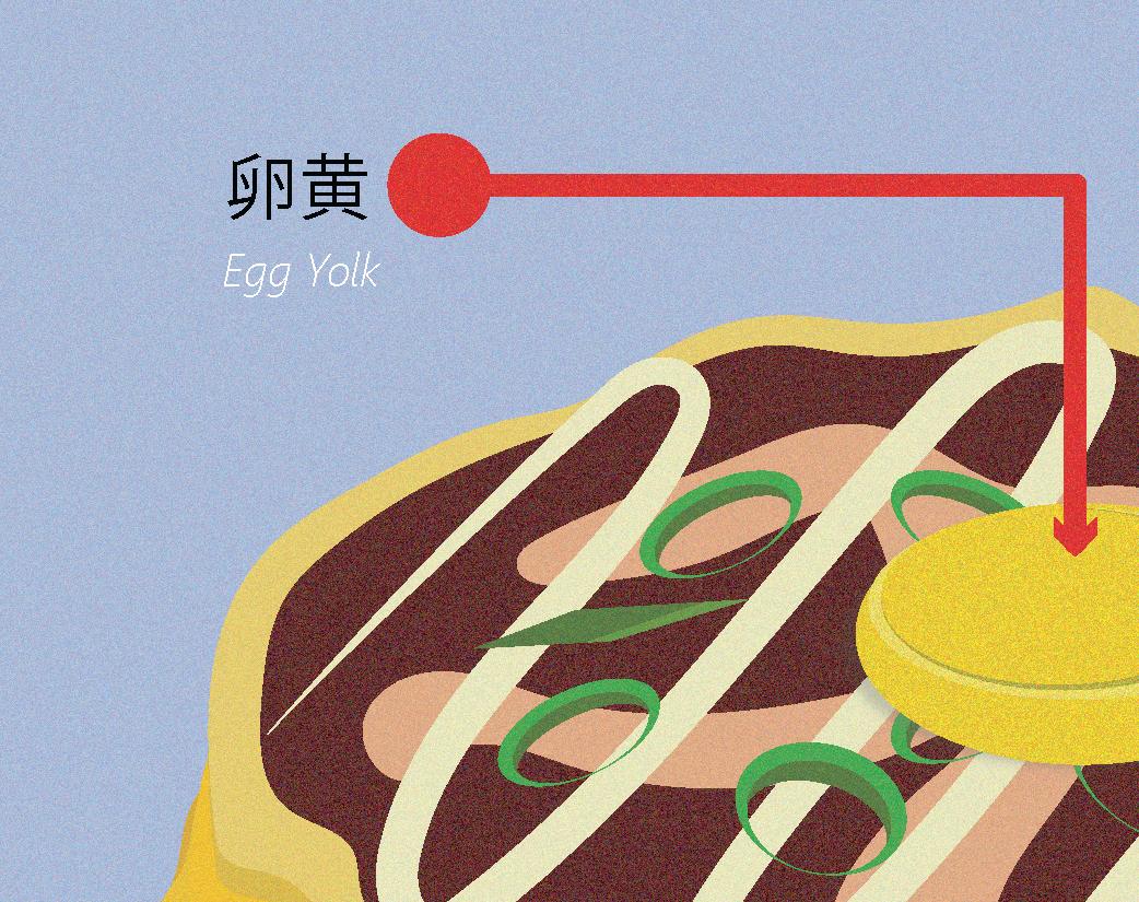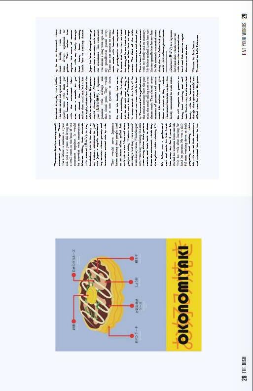 The illustration in the layout [right] provides the reader with the insight of what okonomiyaki is and demonstrates the use of color, design, and creativity to deliver that information.