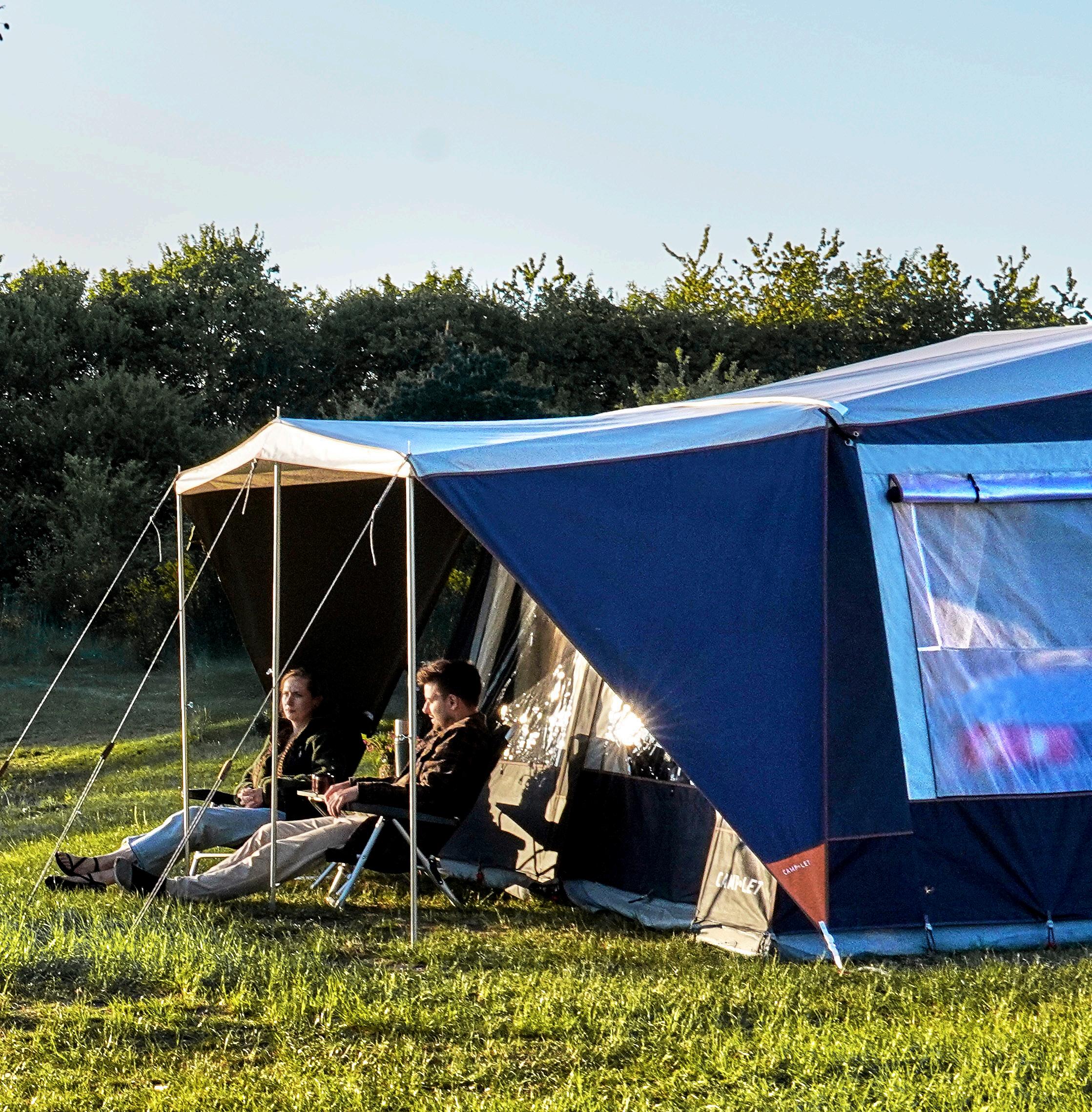Le Camp-let North offre de la place pour toute la famille. D’une surface de 18 m 2 , le vaste espace de vie et les cabines de couchage ventilées peuvent accueillir 4 personnes. Et si vous décidez de rester plus longtemps à un endroit, vous pouvez facilement agrandir l’espace avec une solette et une annexe.