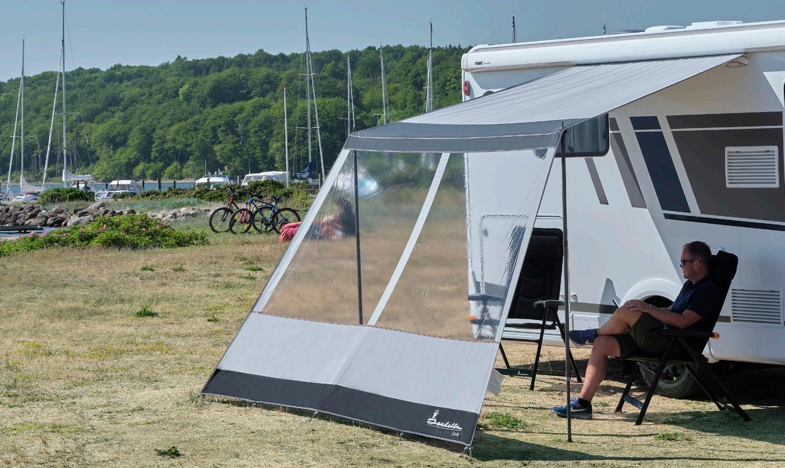 Se avete bisogno di un riparo o di un po’ di calore in una giornata fredda, Buddy è una soluzione facile e flessibile. Due lati e un frontale creano uno spazio abitativo chiuso sotto il tendalino del vostro camper. I forti magneti tengono uniti il tetto e i pannelli laterali del tendalino, mentre la parte anteriore si infila semplicemente. Il tendalino vi permette di creare uno spazio abitativo chiuso e una veranda coperta sotto il tendalino del camper.