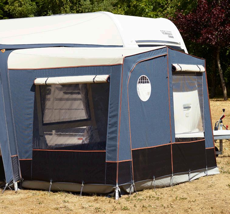 łatwe powiększenie powierzchni mieszkalnej podczas wakacji na kempingu. Jest produkowany w Europie z wysokiej jakości materiałów, które są długotrwałe i łatwe w utrzymaniu i zapewniają wysoki poziom komfortu. Przód i boki można odpiąć, aby poprawić obieg powietrza w gorące letnie dni.