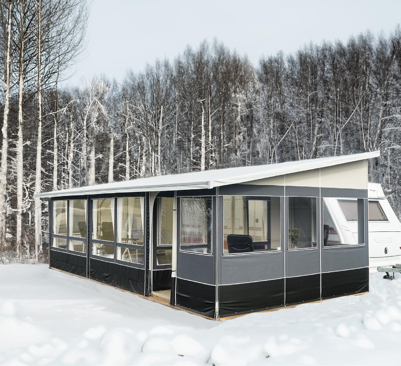 Dzięki wytrzymałym materiałom, specjalnemu nachyleniu dachu zapobiegającemu gromadzeniu się śniegu, wyjątkowo szerokiemu zewnętrznemu fartuchowi przeciwbłotnemu, mocnemu stalowemu stelażowi, elastycznemu mocowaniu kołkami i folii okiennej odpornej na ekstremalne temperatury, przedsionek Winter firmy Isabella przetrwa – nawet podczas silnej burzy śnieżnej. Model wykonany z łatwego w czyszczeniu materiału poliester / PCV,