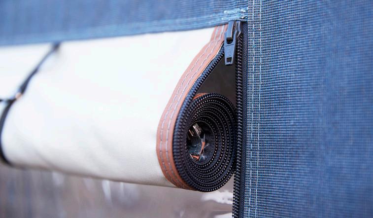 Okno w zdejmowanym panelu przednim zapewnia naturalny dopływ światła i dobry widok. Po obu stronach znajdują się drzwi i moskitiera, które można zamknąć, zapinając nad nimi foliową osłonę.