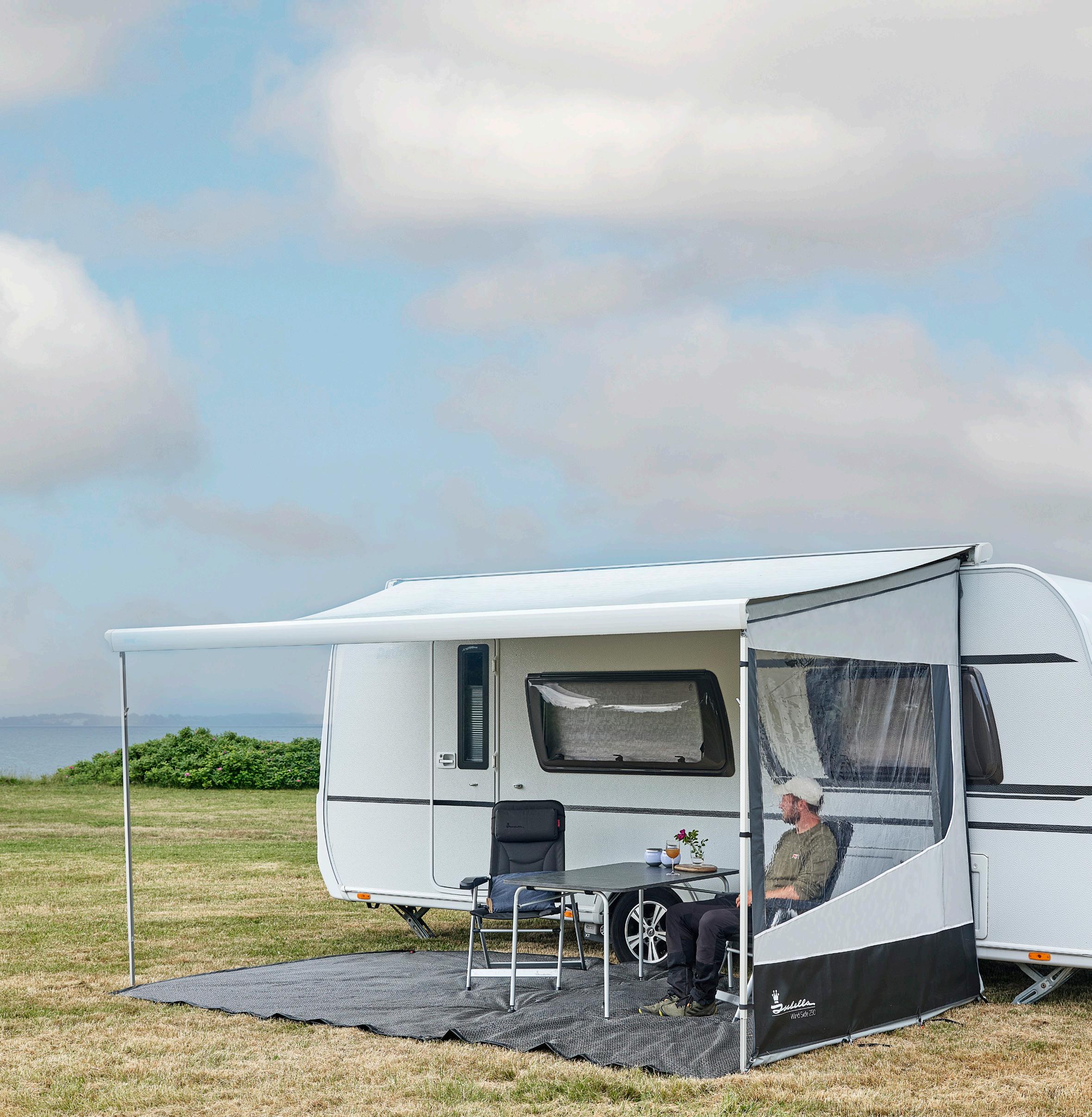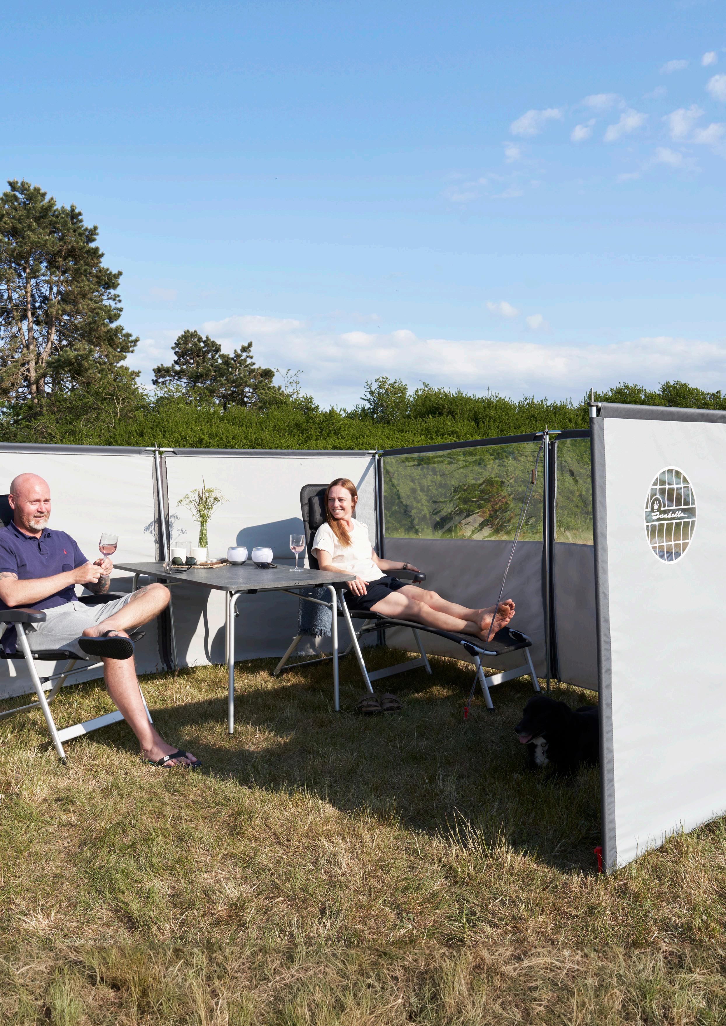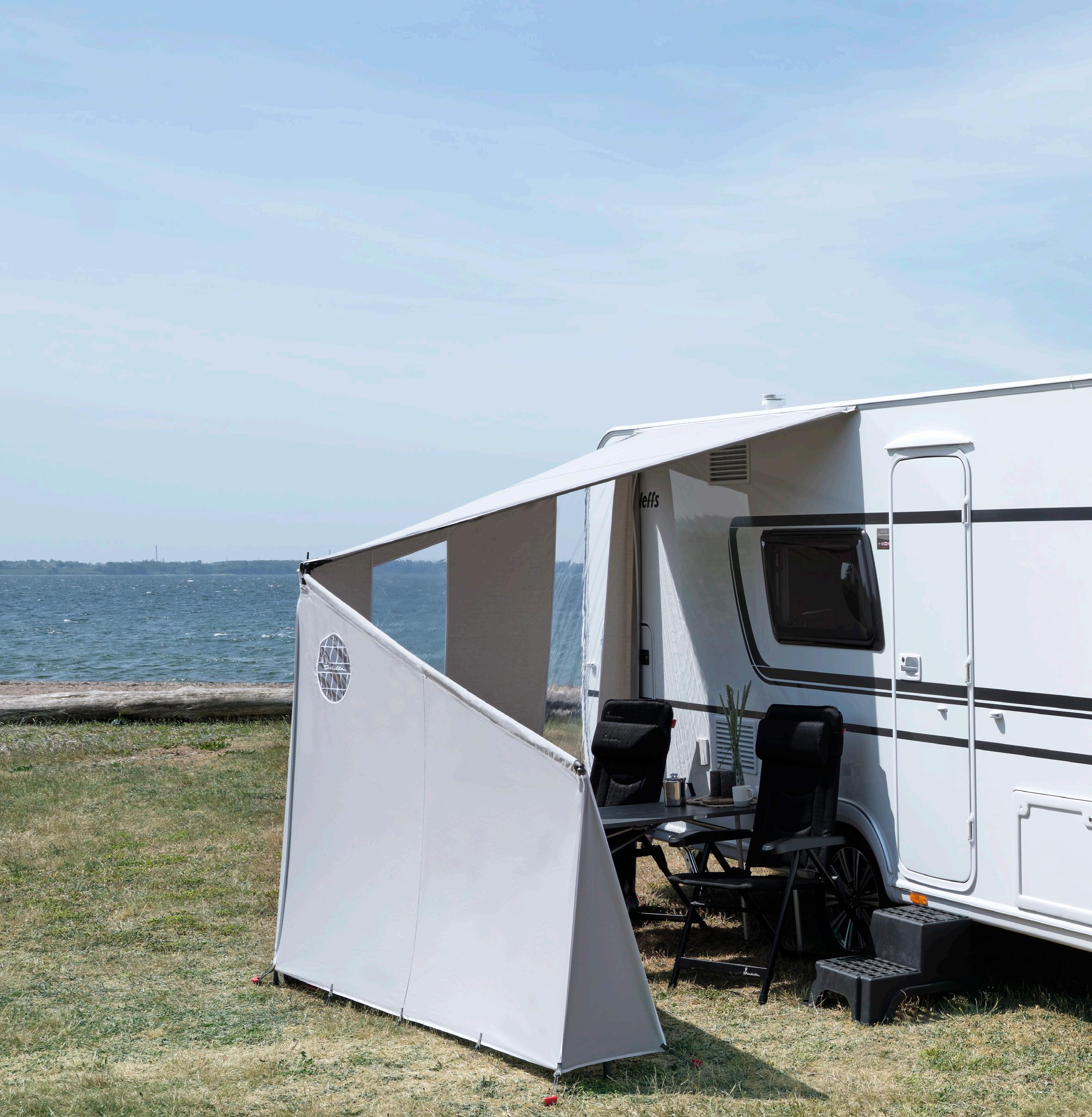 Aby uzyskać dodatkowe schronienie, można połączyć Windside z Windfront, który można również łatwo zamontować na rozwijanej markizie przyczepy kempingowej.