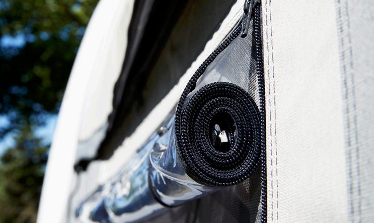 La veranda Nordic è ricca di soluzioni pratiche che fanno la differenza nella vostra vacanza in campeggio. Oscuranti per le finestre, offrendo così privacy e protezione dai raggi solari