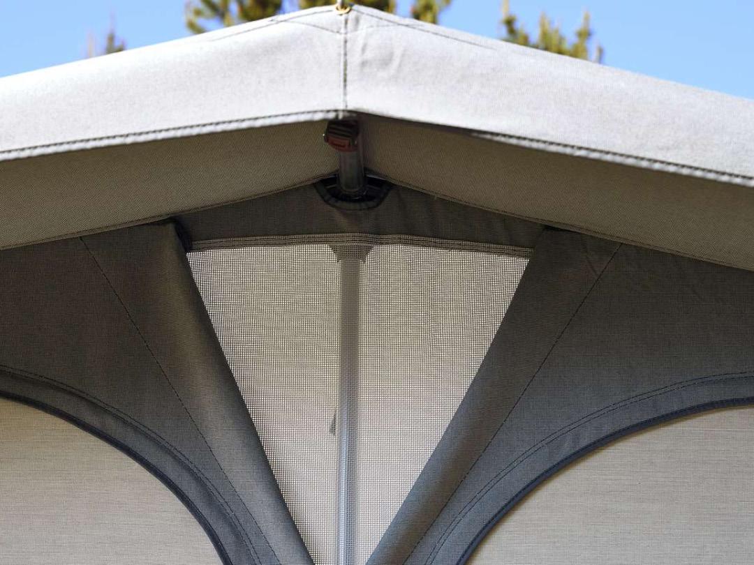 Il materiale del tetto è composto da un mix di poliestere e PVA, in modo da ridurre al minimo la condensa all’interno. Il PVA assorbe l’umidità e ritarda la condensa. All’esterno, il tetto è rivestito da 3 strati che lo rendono facile da pulire e resistente allo sporco e ai raggi UV.