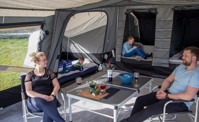 Bijzondere details: Het middenkruis in het front zorgt voor een stahoogte van 225 cm, modules zorgen voor eindeloze uitbreidingsmogelijkheden. Lichtpanelen in het dak zorgen voor voldoende sfeer en licht in de voortent. Matte raamfolie onderaan in de zijkanten. Donkere slaapcabines met ventilatiemogelijkheden zorgen voor een goede nachtrust. En de voorkant kan opzij gerold worden om een deur te maken.