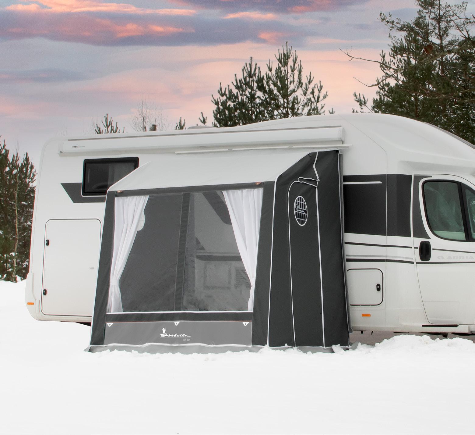 Thanks to the heavy-duty materials, a special roof angle to prevent the buildup of snow, an extra wide external mud flap, a strong steel frame, flexible pegging and window foil designed to withstand extreme temperatures, Isabella’s Winter awning will stay the course – even in a heavy snow storm. The model is made of easy-toclean polyester/PVC material and has doors in both sides as well as zipped ventilation.
