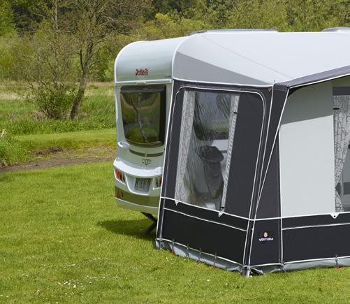 Forteltet slutter tæt til siden af campingvognen takket være de isyede skumpuder og det medfølgende tilslutningssæt.