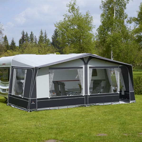 Leveres som standard med: Skruefrie FixOn-beslag, gardiner Luxor Grey, understykke, standard hjulafdækning, telttaske, stangog pløkpose.