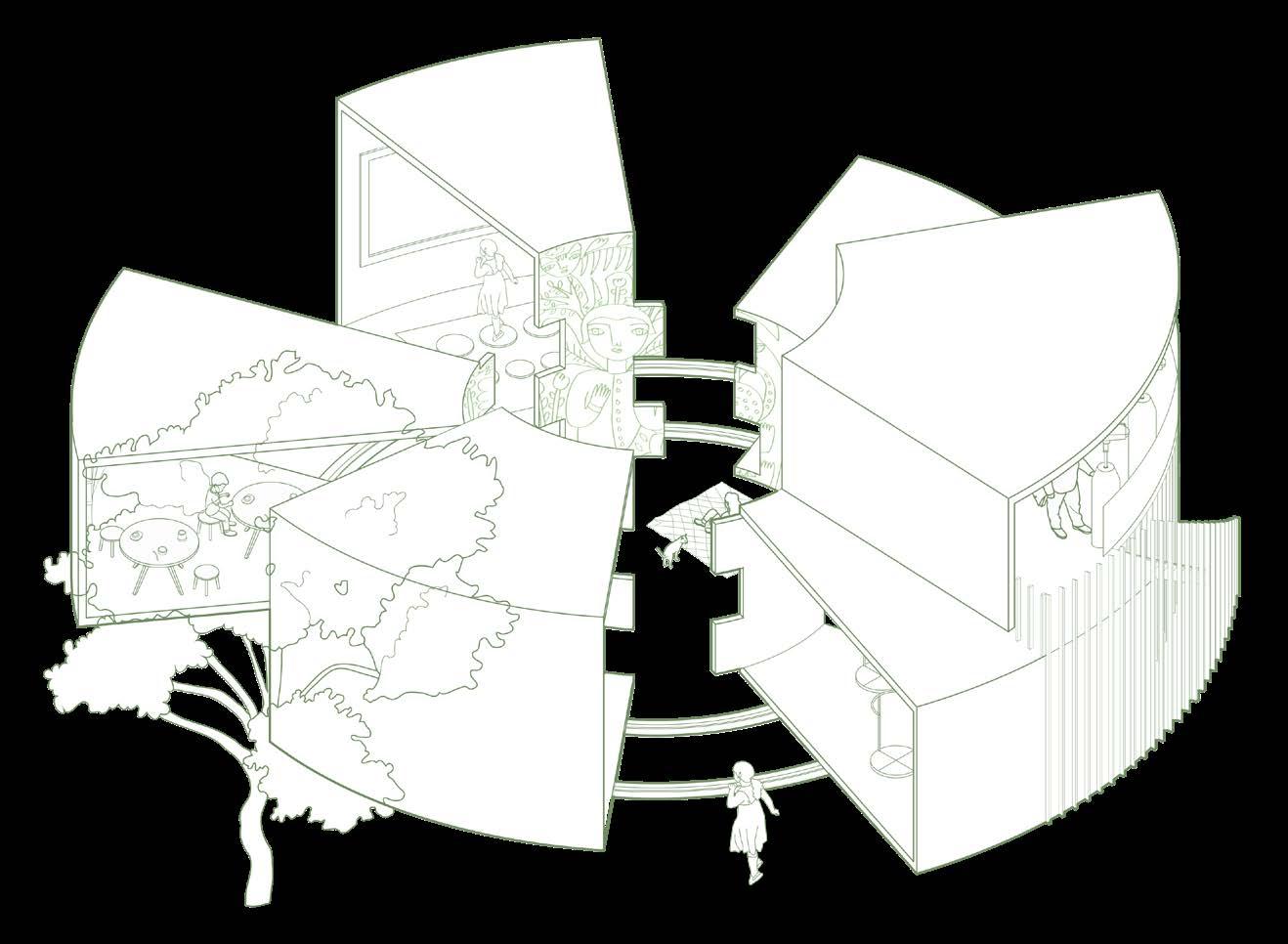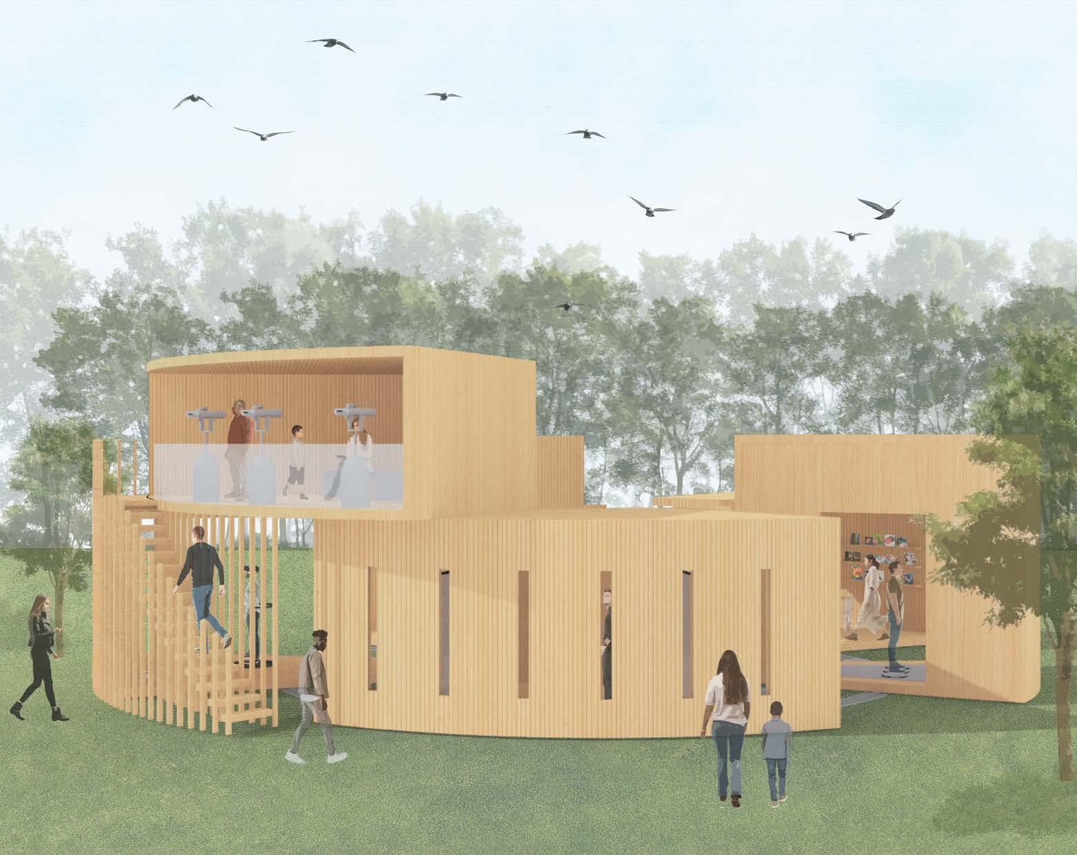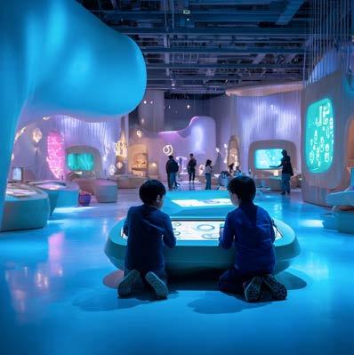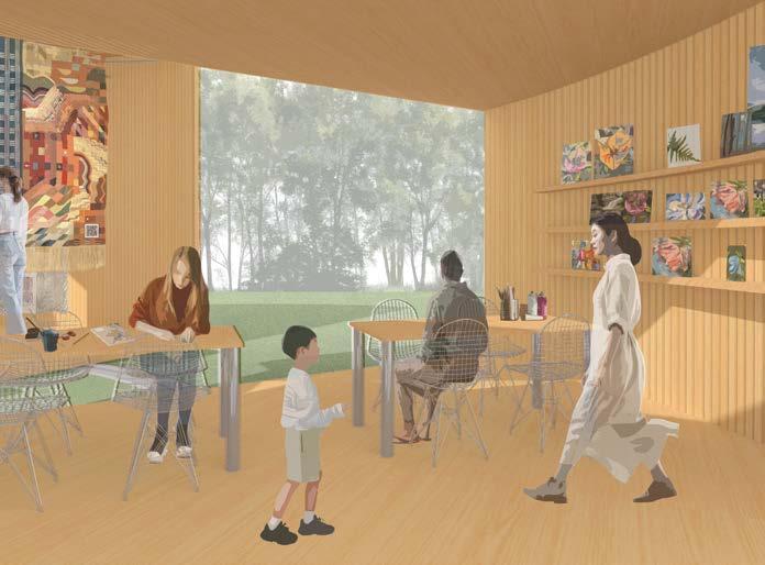 This pavilion blends cultural studies and art to create a multi-sensory, inclusive learning environment. Using art-based Learning methods enhanced by AI, it fosters intergenerational and intercultural exchange through shared creative experiences. Reconfigurable pods offer interactive activities, such as projection, soundscapes, textiles, and workshops, encouraging collaboration across age, language, and ability. The pavilion transforms art into a communal language that connects people and turns cultural history into a living classroom.