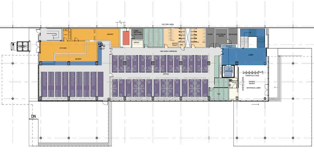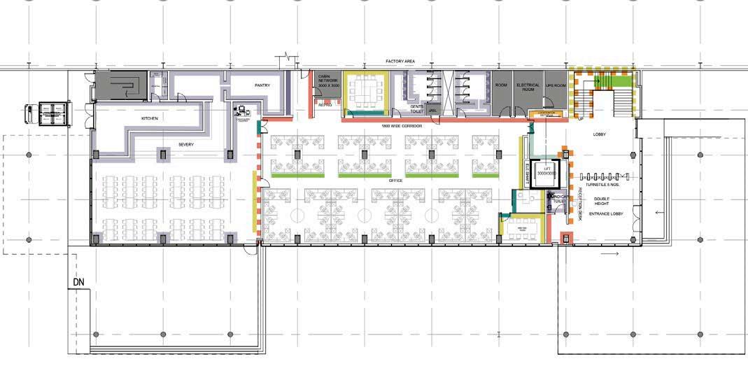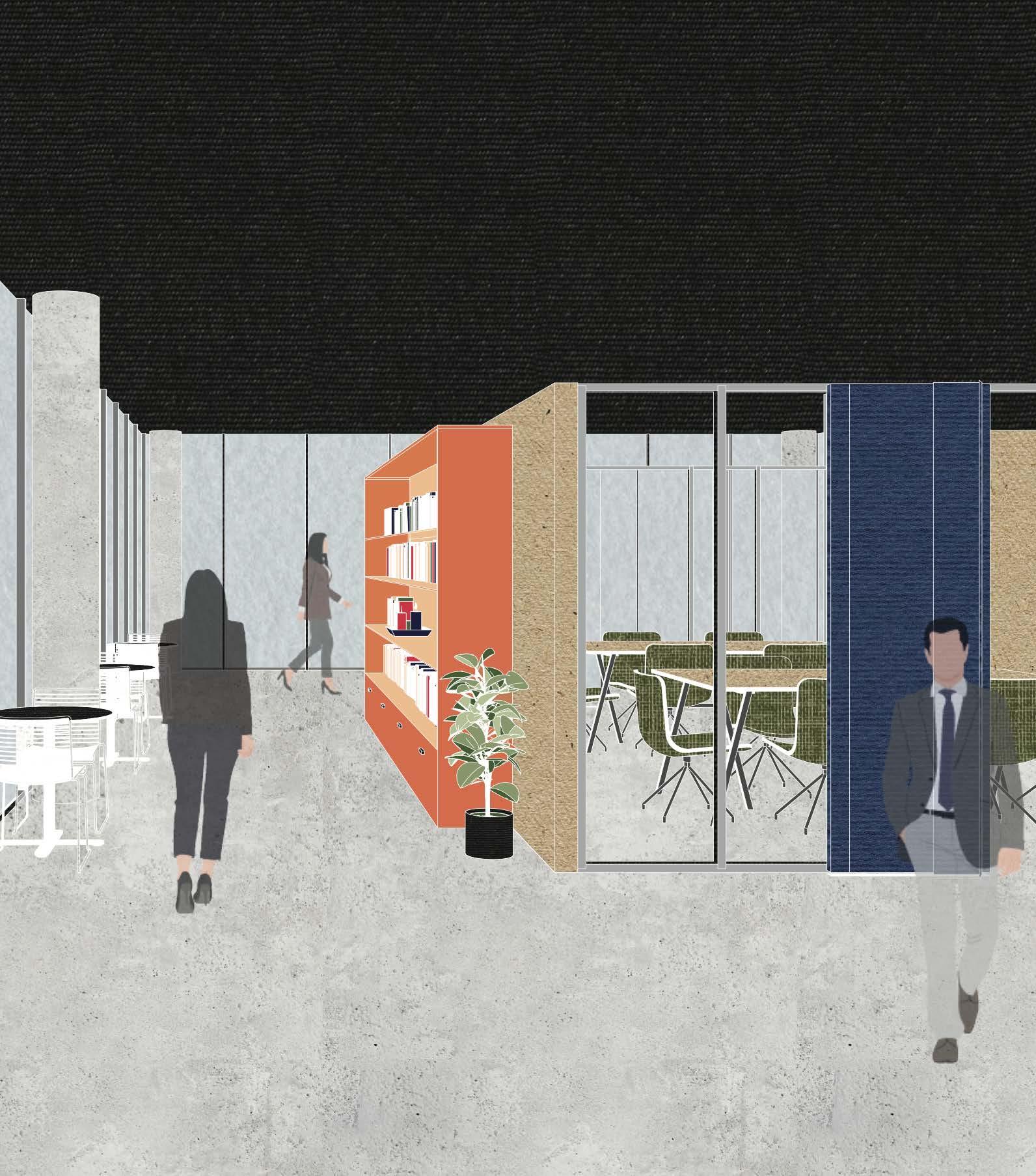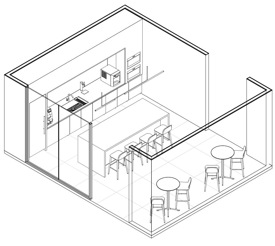 The dining area serves as a collaborative space designed to facilitate employeesʼ breaks by providing a convenient eating place. It features a servery station aimed at simplifying the dining experience for employees.