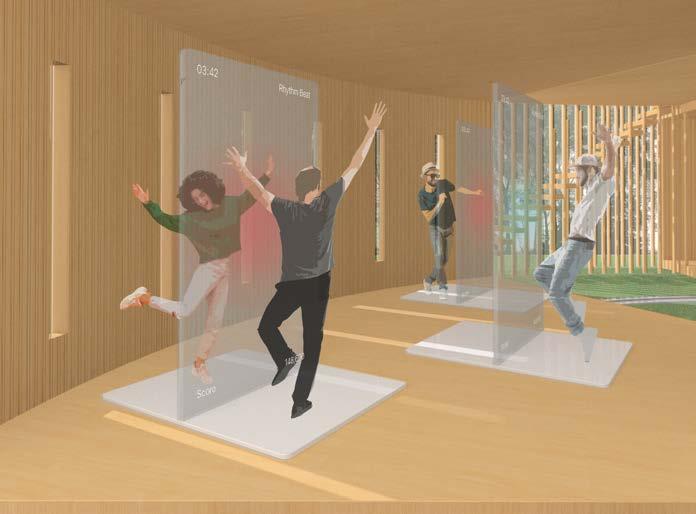 This pod teaches sound and rhythm through dance. Paired users follow a cultural tutorial on digital walls, with AI visuals tracking their movements to encourage coordination and collaboration.