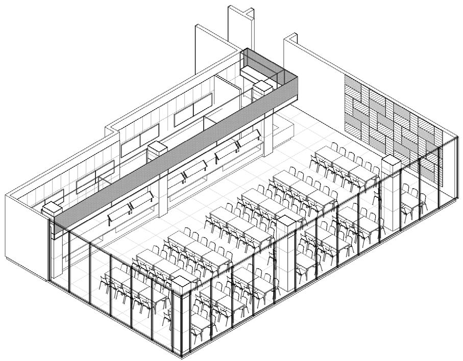 Positioned at the center of the second level, this space is equipped with study tables and acoustic paneling on the walls and ceiling.