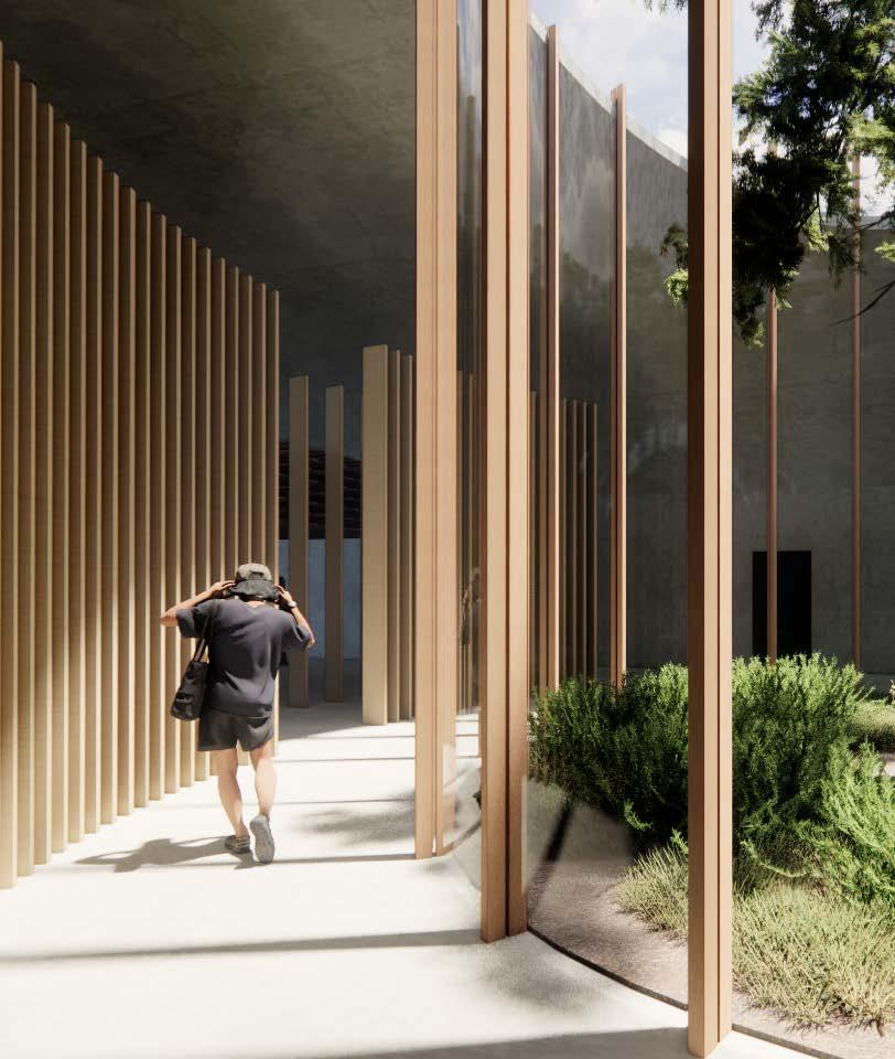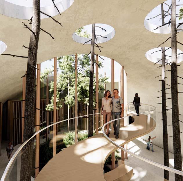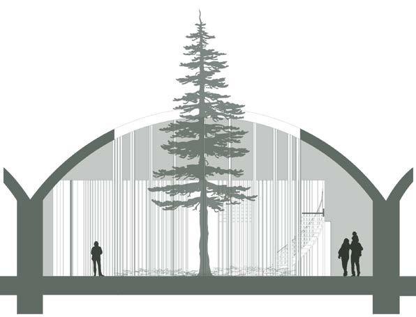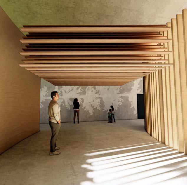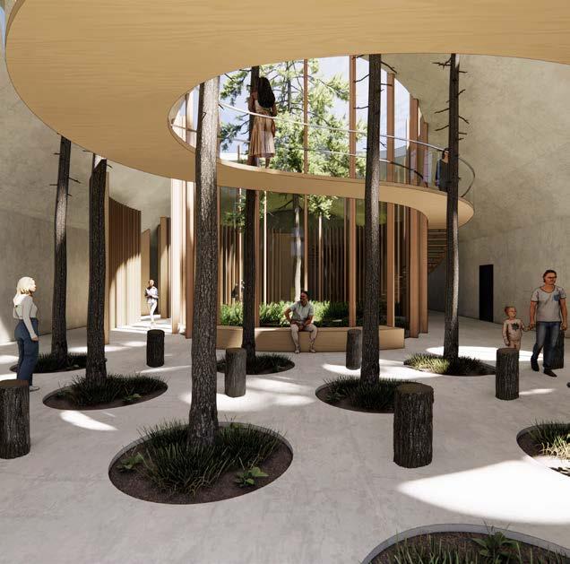 In my design, I focused on the central tree, creating layers around it. The center tree symbolizes the core of the trunk, while the outer walls represent tree rings, becoming more porous as you move inward. At the beginning of the exhibition space, there is a forest that illustrates the tree growth pattern for harvesting. This method, known as cross-section cutting, involves selectively cutting down every other tree in a pattern, allowing new trees to grow in between.