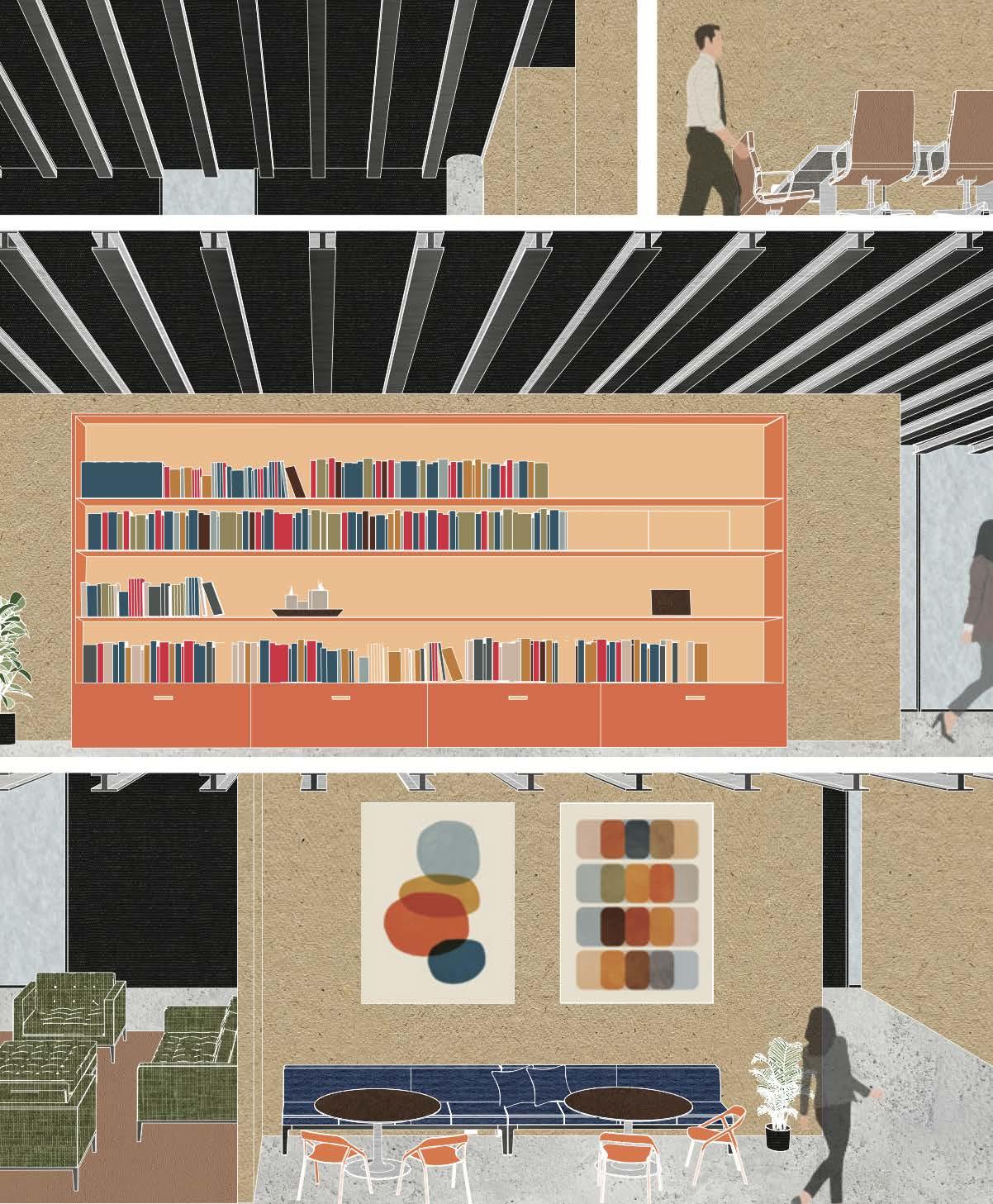 The program of the community center unfolds in spatial layers: a welcoming reception, communal dining and lounge areas, and flexible spaces for library, study, and collaboration. Together, these layers build a framework for interaction, learning, and shared experience