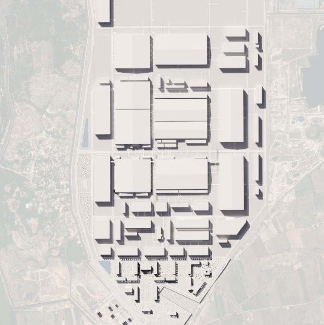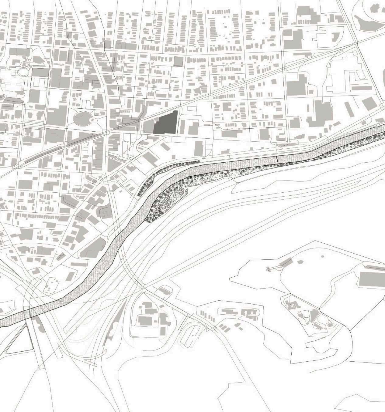 The greenery of the surrounding areas is highlighted in green, emphasizing the vegetation within the urban site.