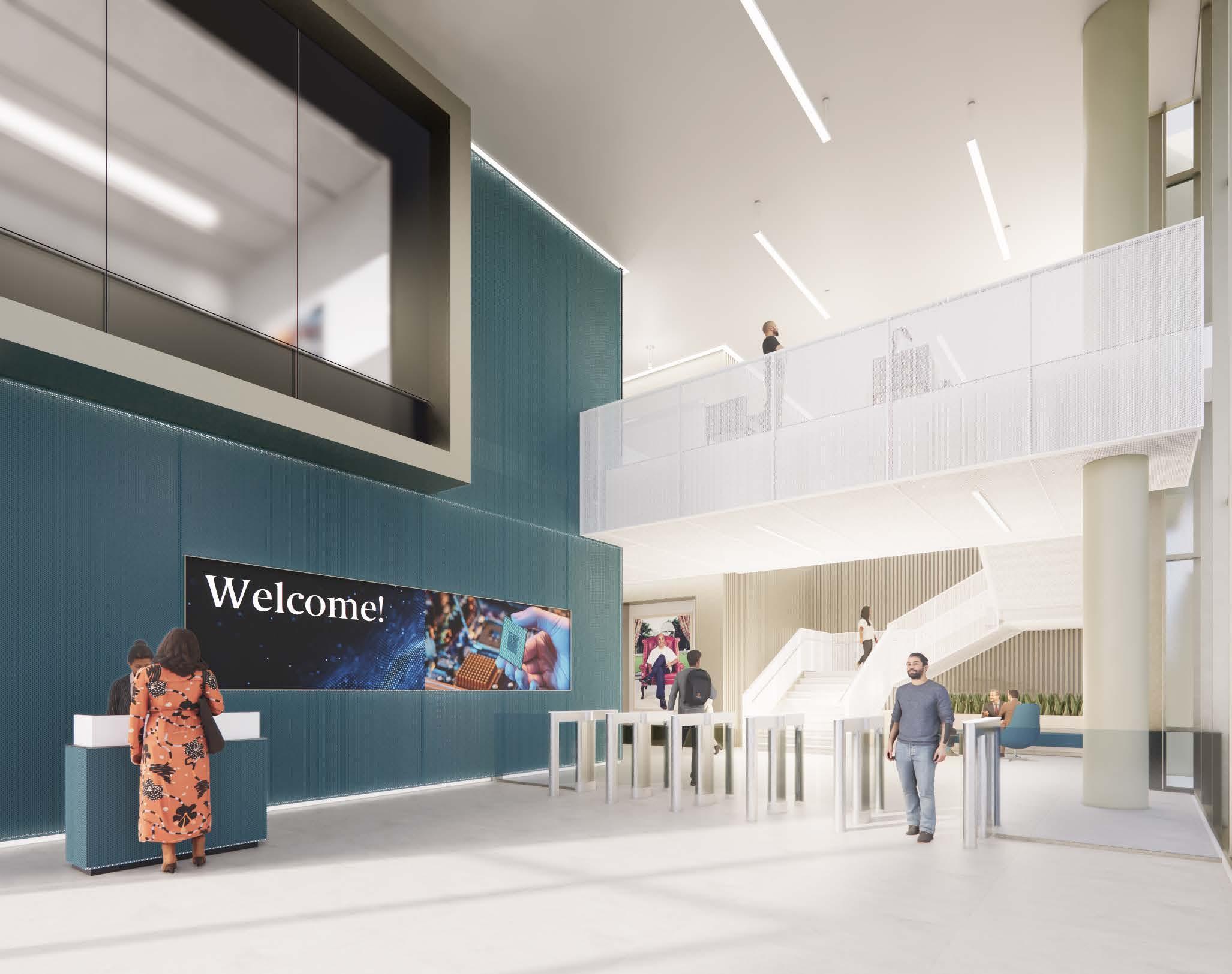 The lobby is the main entry and reception area for visitors, employees, and deliveries. It typically features a welcoming and functional design, with comfortable seating, informational signage, and often a reception desk or check-in area. Depending on the building layout, there may be multiple lobbies situated in different wings of the structure. Lobby