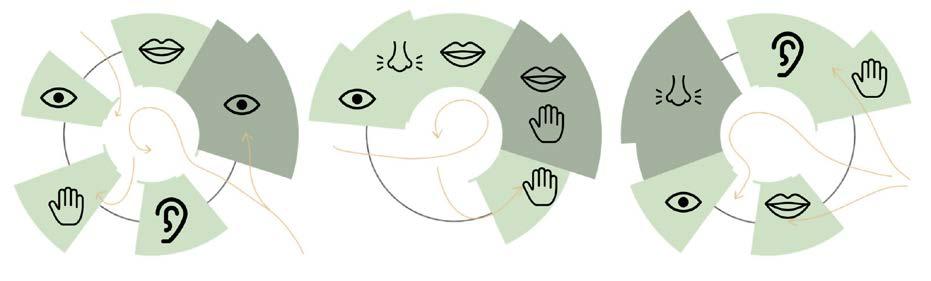 Different configurations shape circulation within the structure. Grouping pods creates a continuous multi-sensory journey, while separating them highlights individual senses or paired experiences.