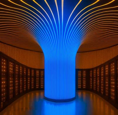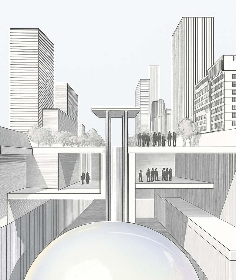 From the exterior, the design remains intentionally understated. Rather than competing with the surrounding towers in scale, the form is kept compact yet striking. This restraint shifts the emphasis to the immersive spaces located below ground, where the true experience unfolds