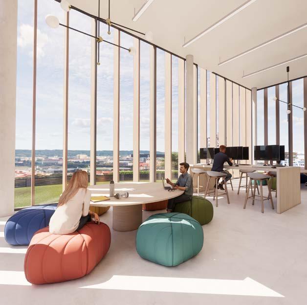 Situated at the South end of the building, the open collaboration space offers communal tables and computer stations