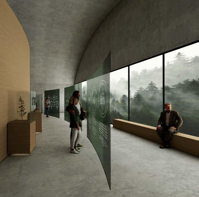 Showcases tree harvesting patterns before manufacturing, immersing visitors in a forest-like experience
