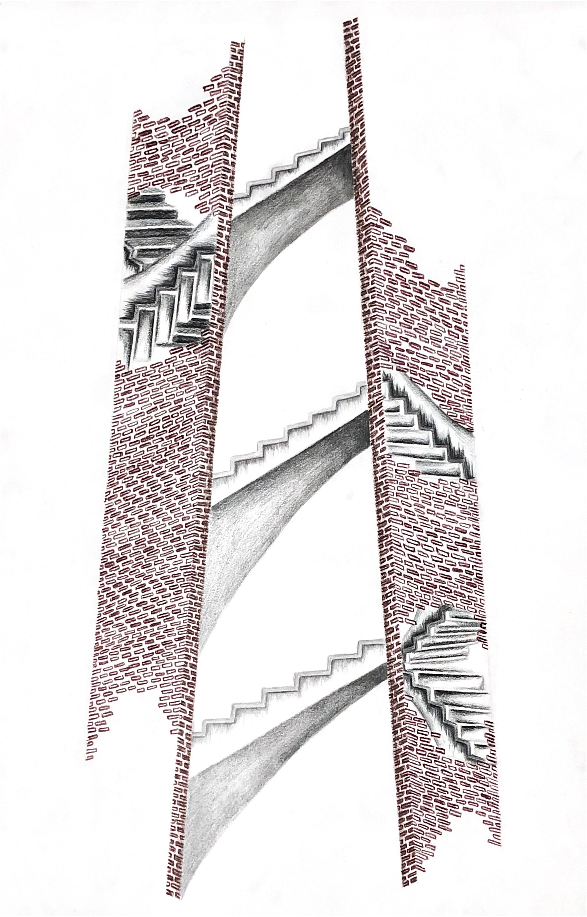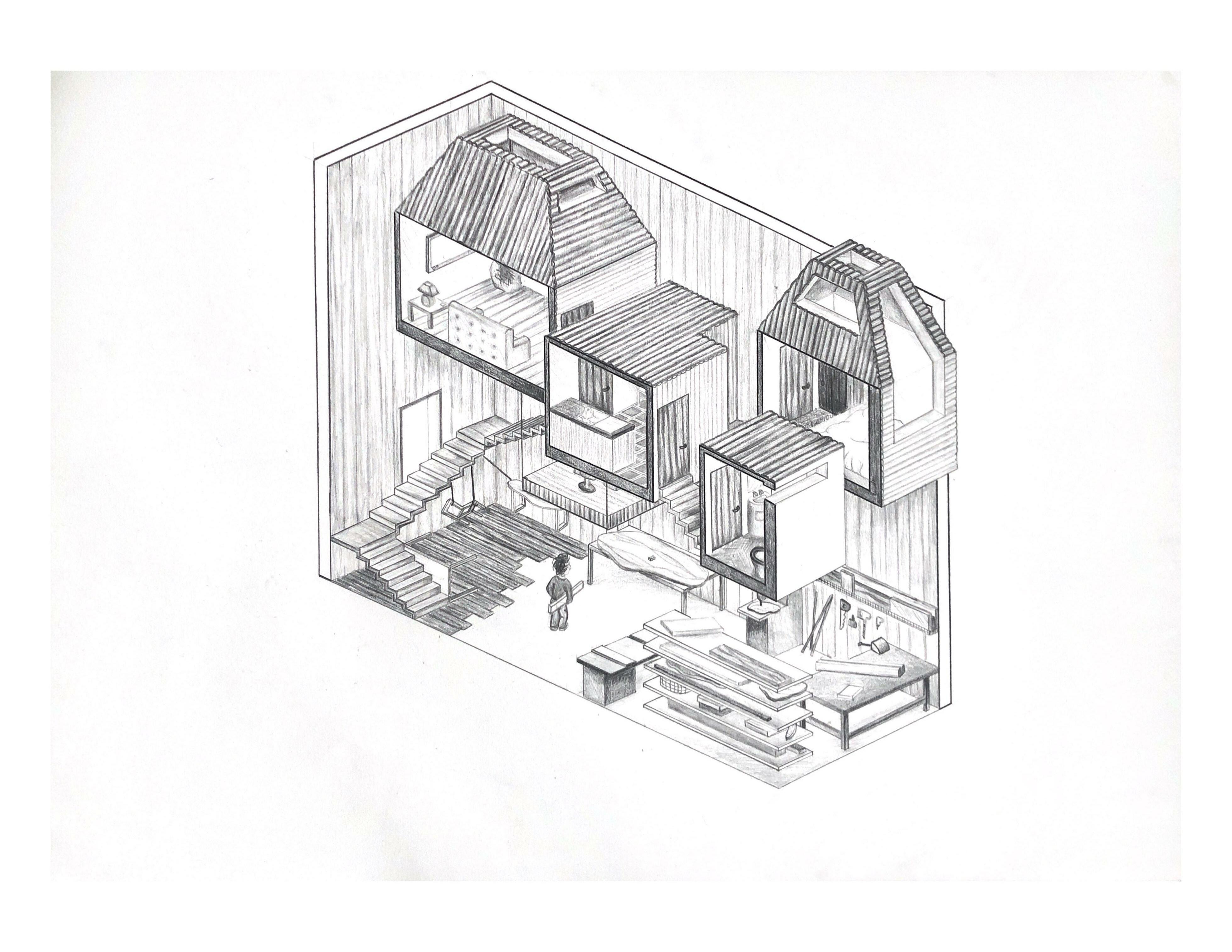 Hand-drawn pieces from my first year of studies. These include a working and living space for a carpenter, situated on a narrow site in central Belfast. The suspended living spaces form a ‘floating’ spatial layout above the work space. The proceeding piece is an interpretation of the Queen’s University maths and physics building inspired by Escher’s ‘Relativity’.