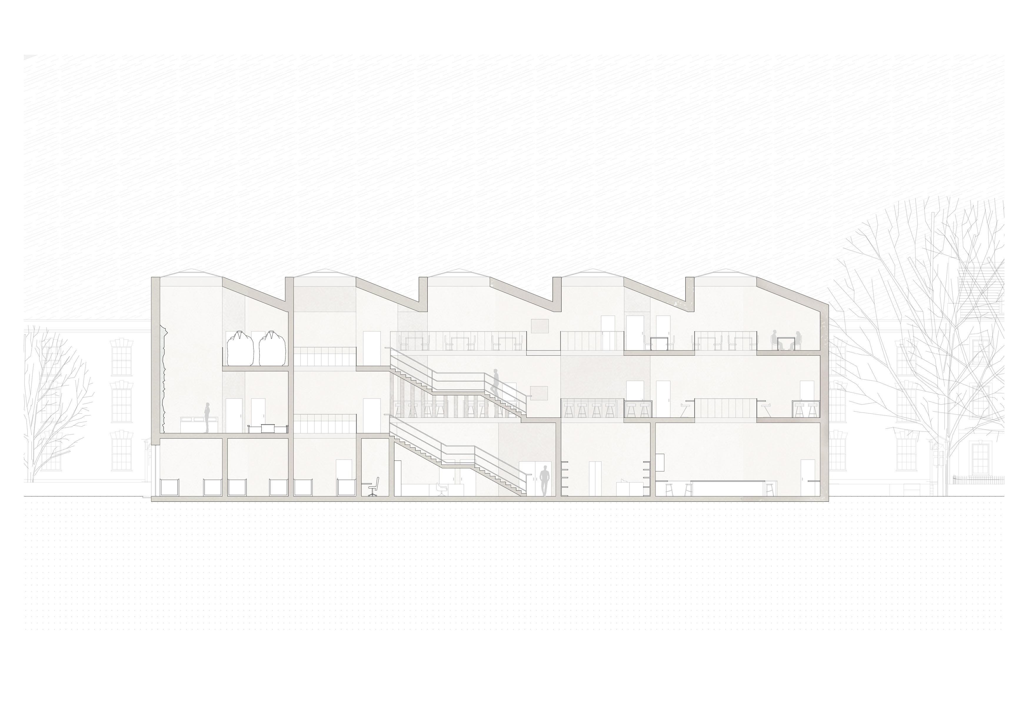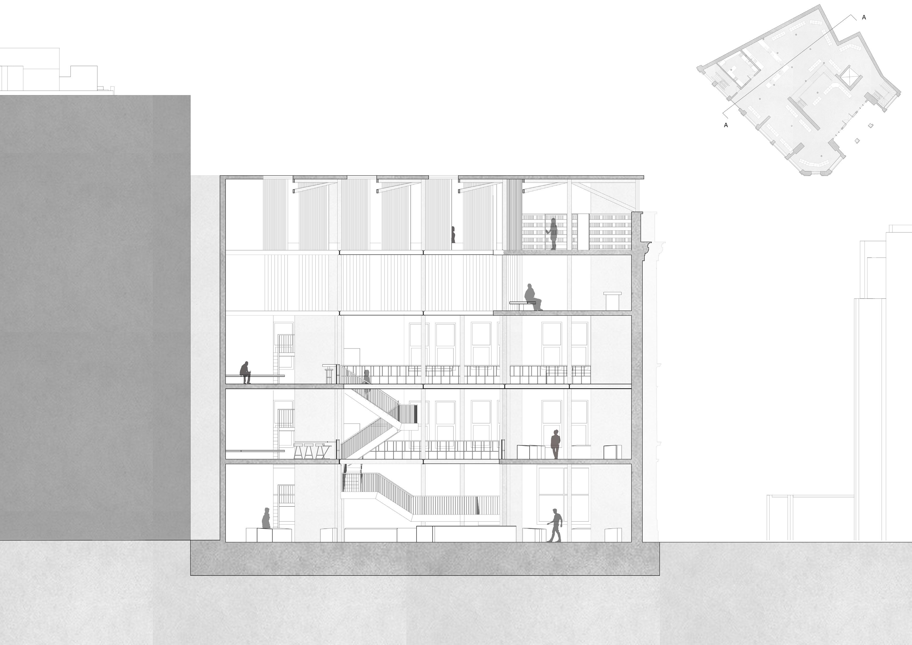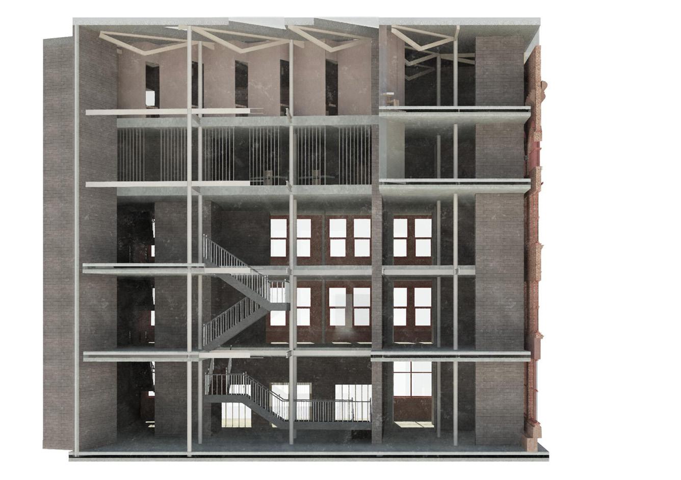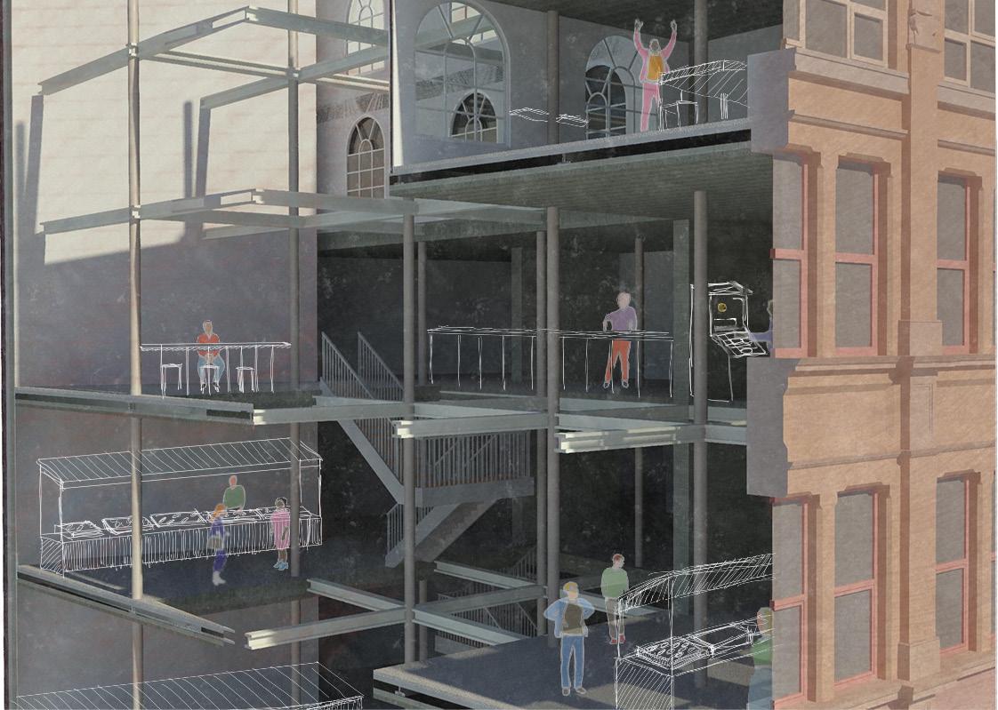 This project involved the adaptation of the Belfast Telegraph Building into a students’ union with market halls, art gallery and library. The existing primary structure and facade are maintained to lower environmental impact and preserve the historical integrity of the building. The creation of offset voids within each floor plate allows light to trickle through the spaces.