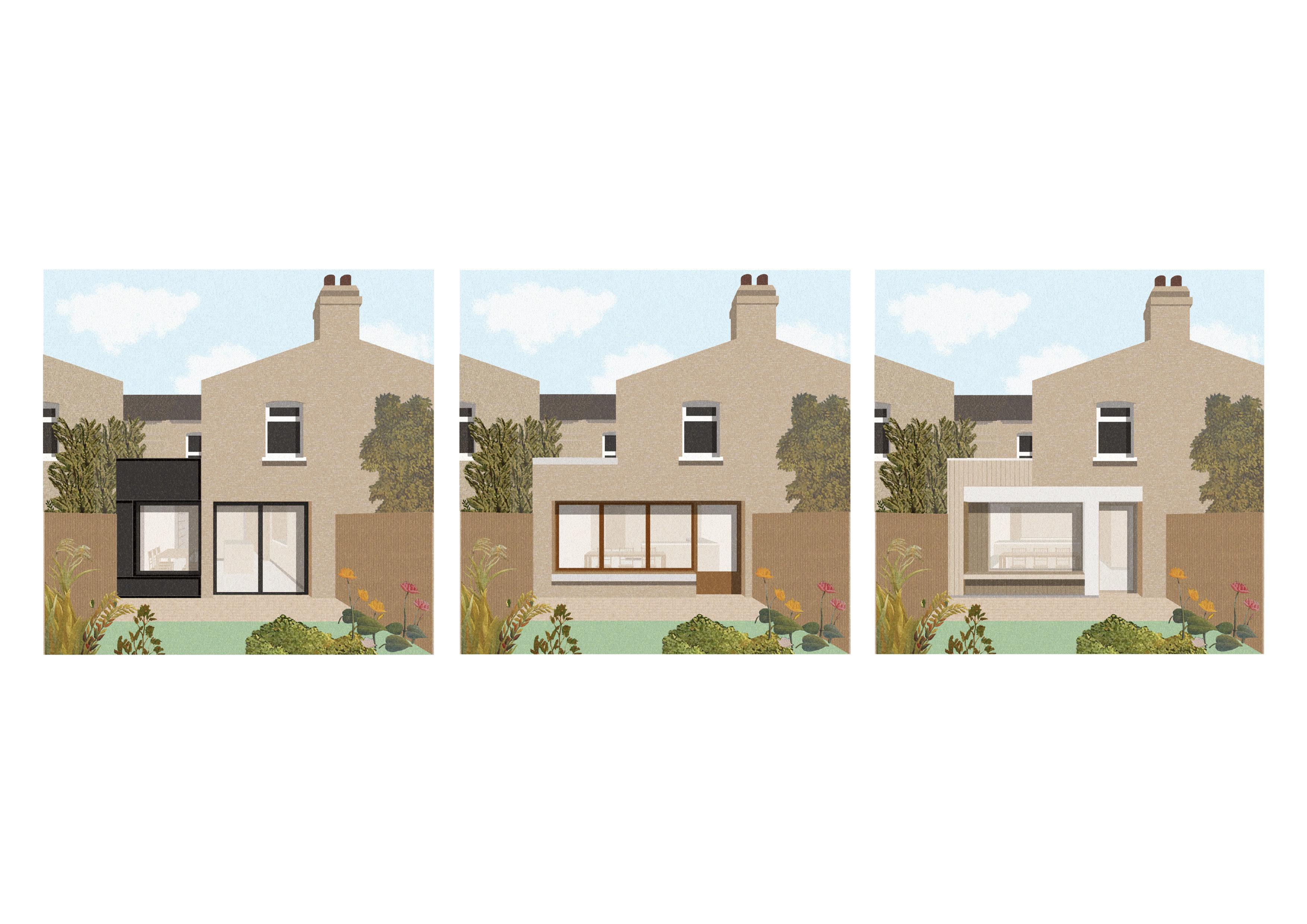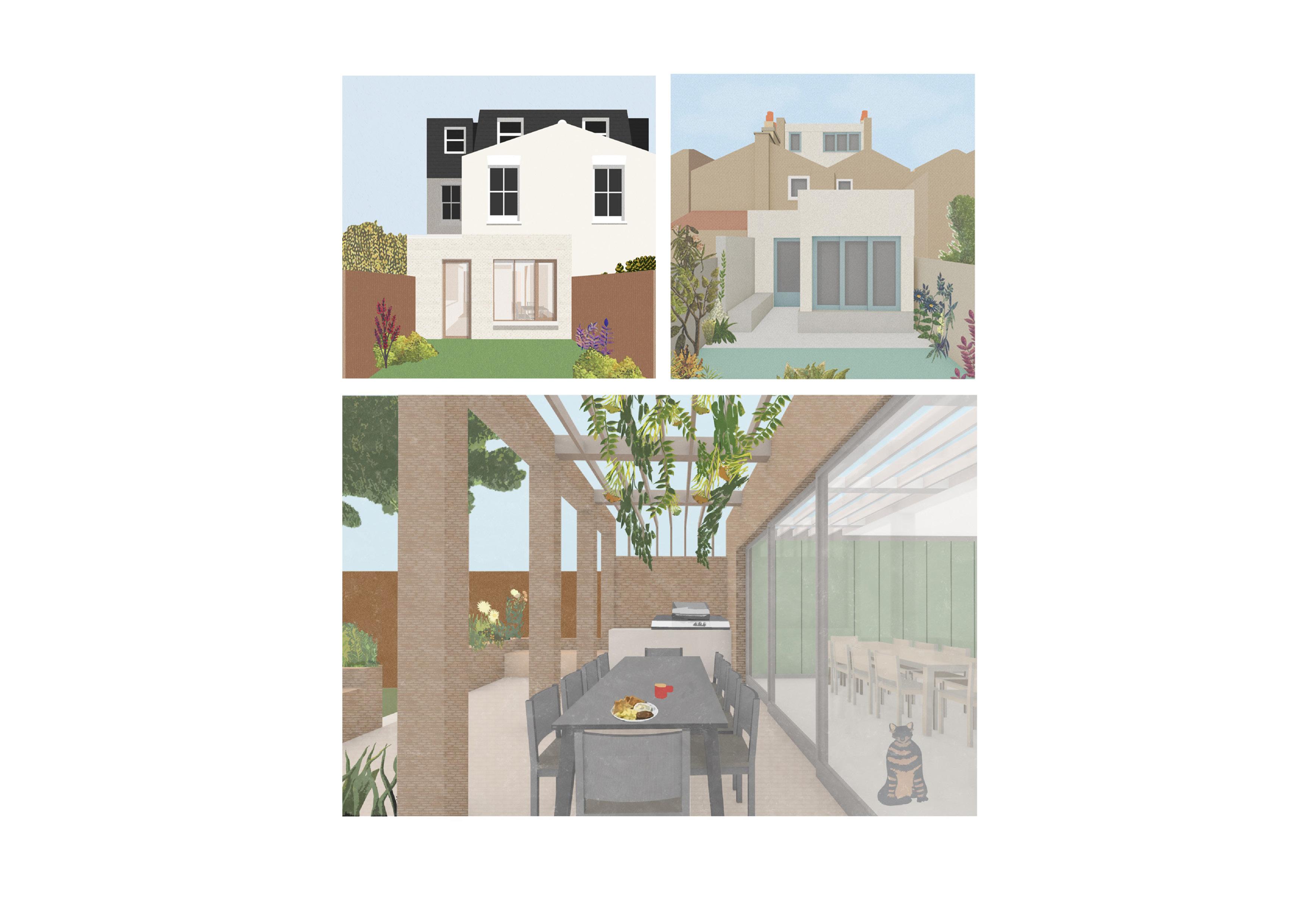 My work for Delve focused on house extensions in London, creating elevations showcasing materiality and form as well as internal and garden views. Additionally, I explored interior design options.