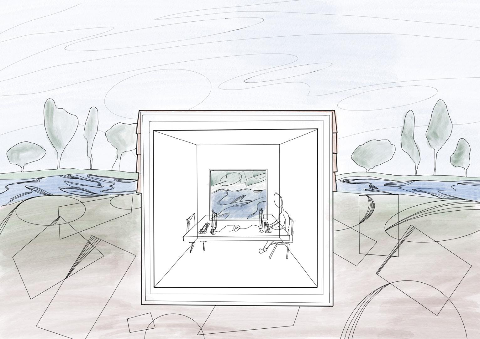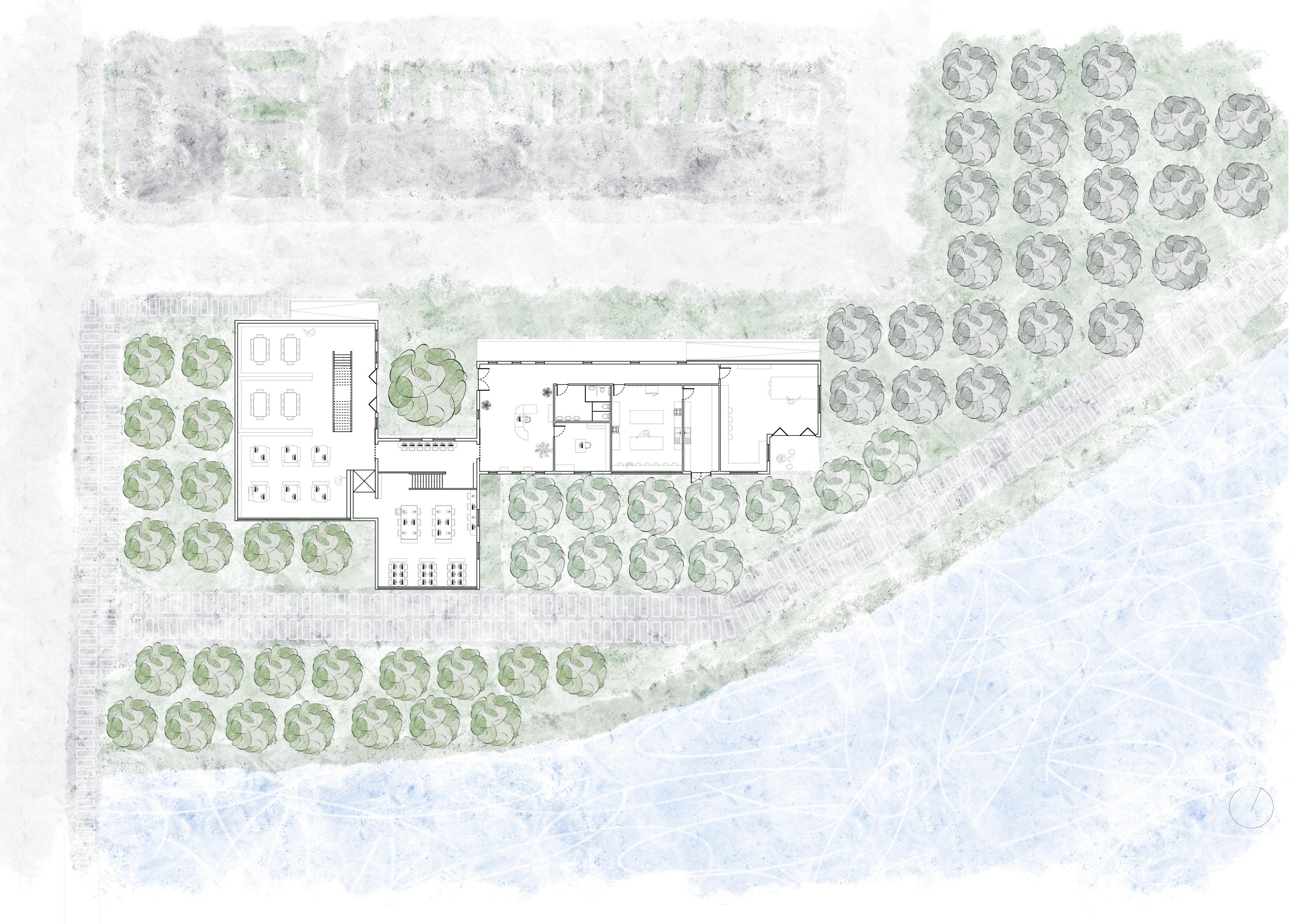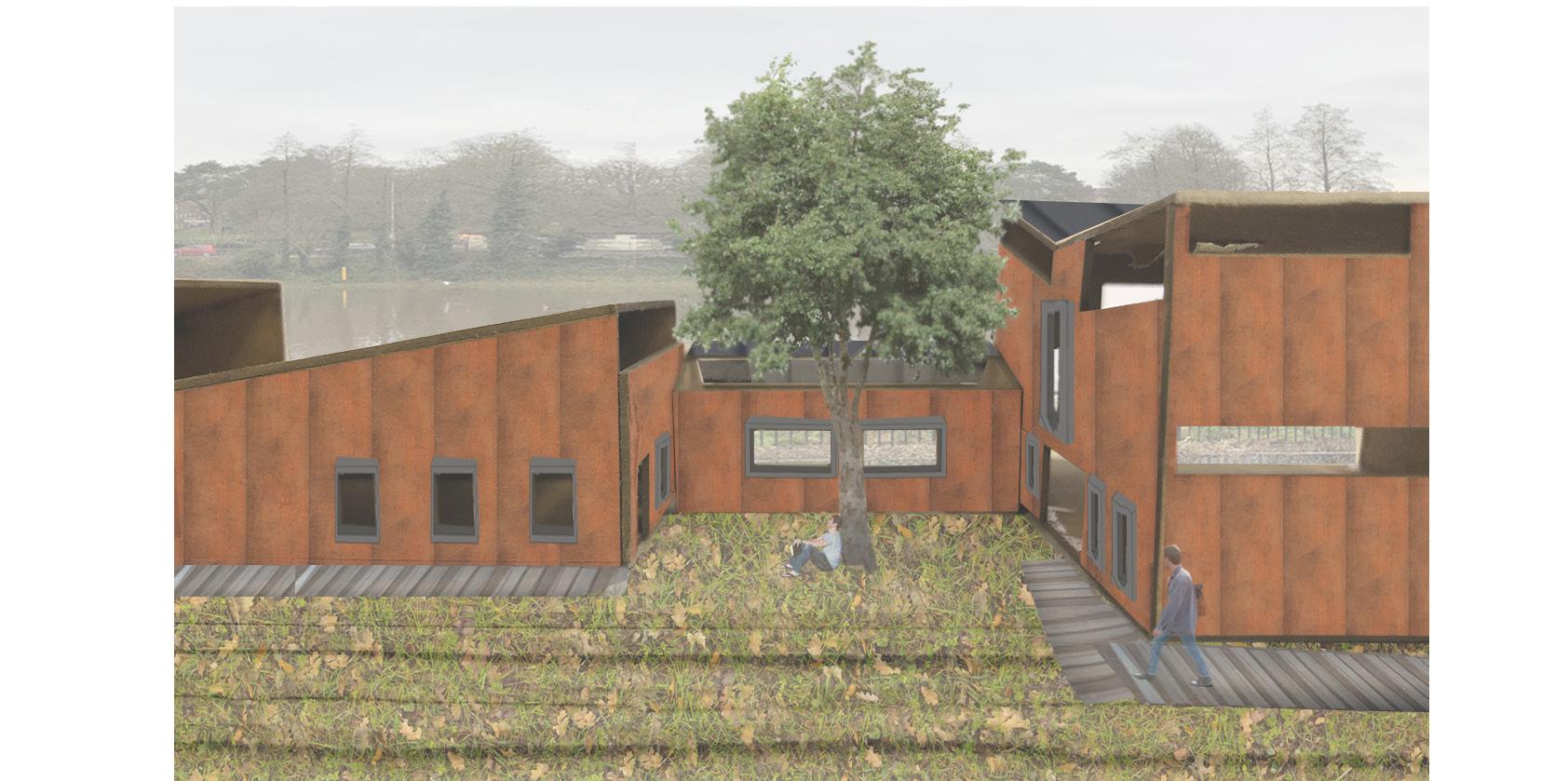 A research space situated by the Lagan river, immersed in orchards and focusing on sustainability through reclaimed materials and low carbon energy systems. The intervention took the form of a pin-wheel to respect an existing oak tree. Picture windows capture views of the river to create enjoyable spaces to inspire the researchers.