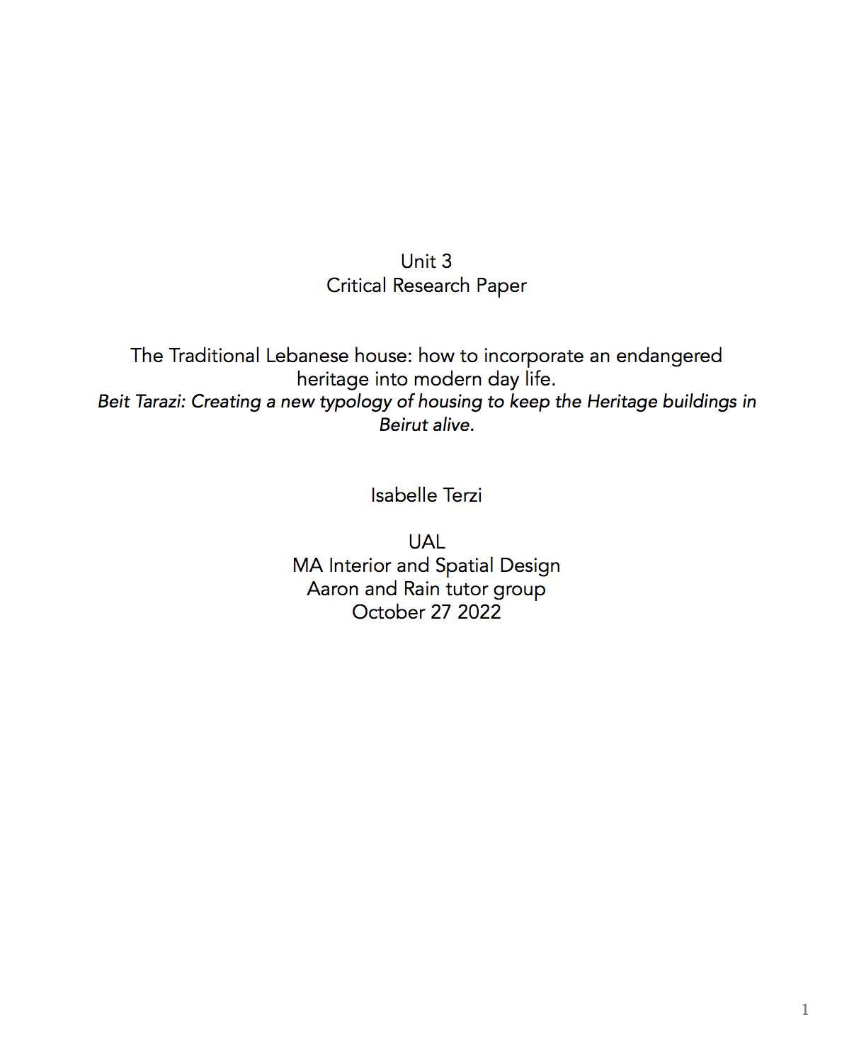Beirut is the capital and largest city of Lebanon. The city is situated on a penin sula at the midpoint of Lebanon’s Mediterranean coast. It has been inhabited for more than 5,000 years, and was one of Phoenicia’s most prominent city-states, making it one of the oldest cities in the world. Given this history, we should be able to find numerous footprints that are the mark of the various civilizations that passed through and found refuge in Lebanon. However, very few monu ments were preserved. This lack of cultural preservation is also shown through the rarity of traditional Lebanese houses, which are slowly being destroyed over the years. These houses have a symbolic importance as Lebanon’s archetypal House and a pioneer in the country’s Architecture. Niched in Saifi, in the centre of Beirut, Beit Tarazi (meaning Tarazi House) is a project created to combine the beauty and charm of the Traditional Lebanese Architecture whilst integrating modern construction elements to create a new typology of house for future constructions. The goal of my project is to keep the tradition alive and not loose touch of our identity and history, while taking in consideration modern-day life and the benefits of new methods of constructions and environmental-friendly elements.