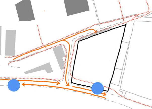 There are two bus stops on the site. The dotted line shows the possible pedestrian path, and the opaque line indicates the possible paths for vehicles.