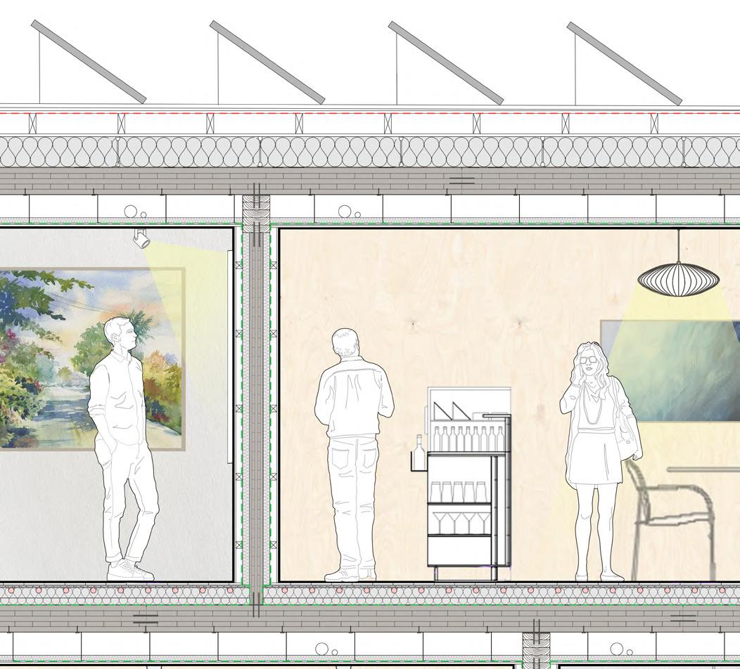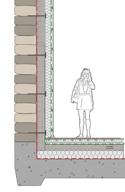 Weather skin 10 Individually cut timber panels fixed onto cladding battens 11 Supporting batten 12 Breather membrane 13 Plywood board 100mm 14 Wood Fibre insulation 290mm 15 Vapour control layer 16 CLT 100m 17 Sound insulation 50mm 18 Fibreboard gypsum 100mm 19 Battens 20 Plywood finish 20mm Weather skin 01 Stone wall fixed on CLT 02 Breather membrane 03 Plywood board 100mm 04 CLT 100mm 05 Wood Fibre insulation 80mm 06 Fibreboard gypsum 100mm 07 Vapour control layer 08 Battens 09 Plywood finish 20mm Two different wall cut sections of the project to show the weather skin buildup. 1 2 3 4 5 6 7 8 9 10 11 12 13 14 15 16 17 18 19 20 21 22 23 a a1 b b1 d e f g h i j k l m n c