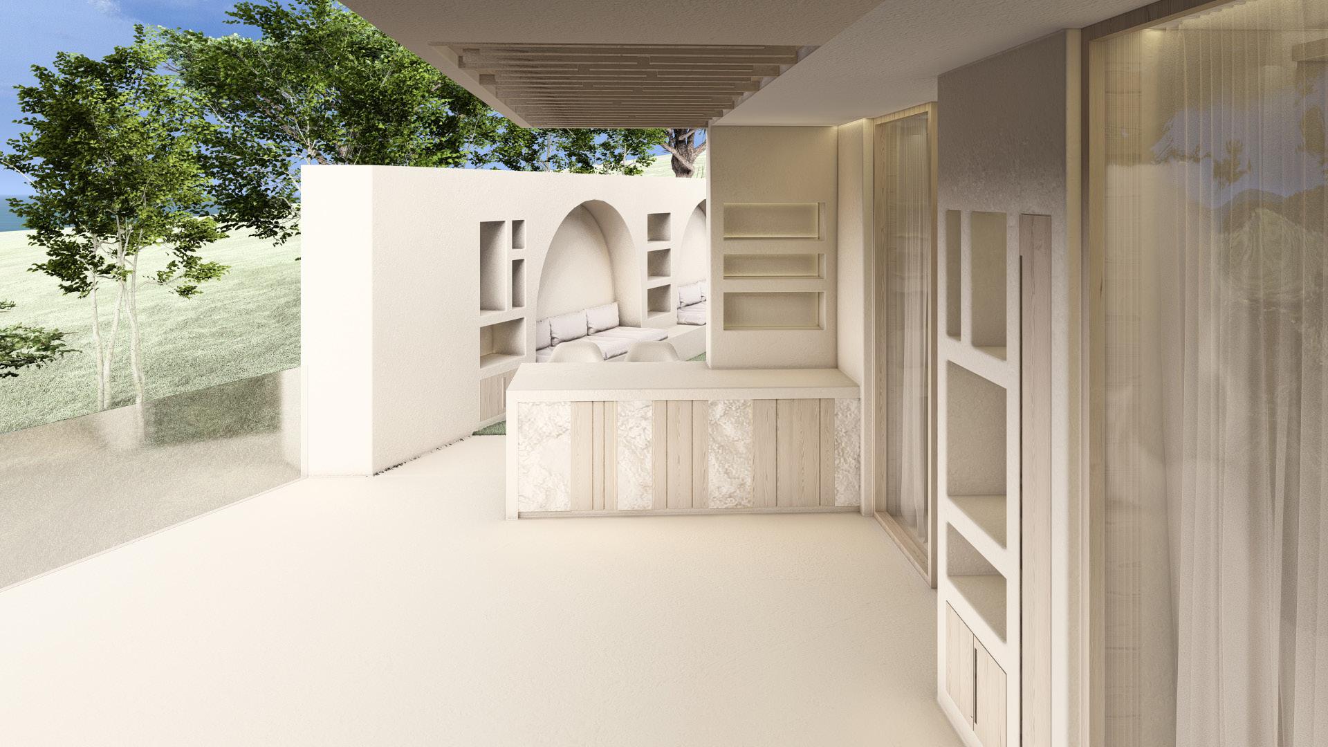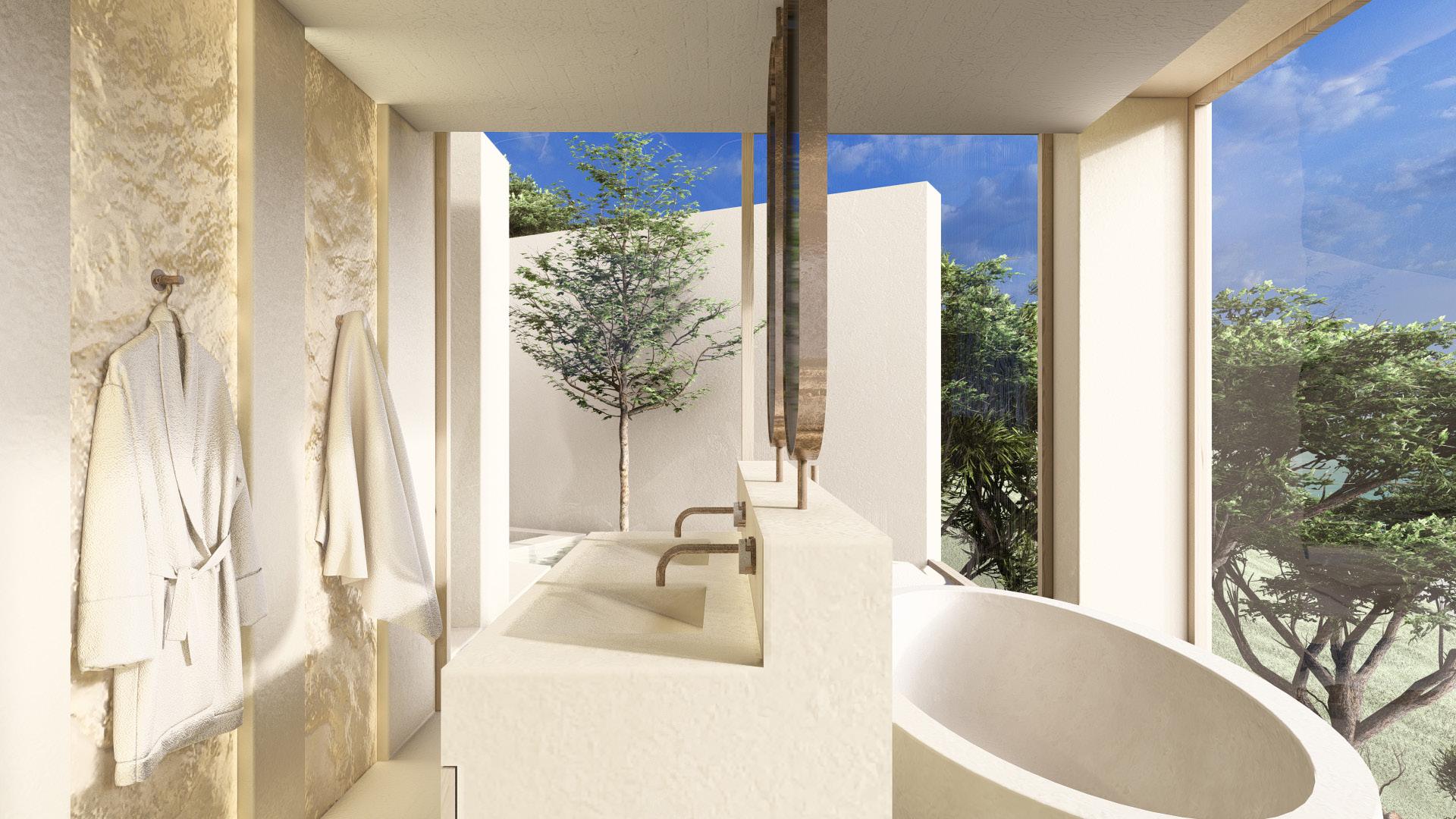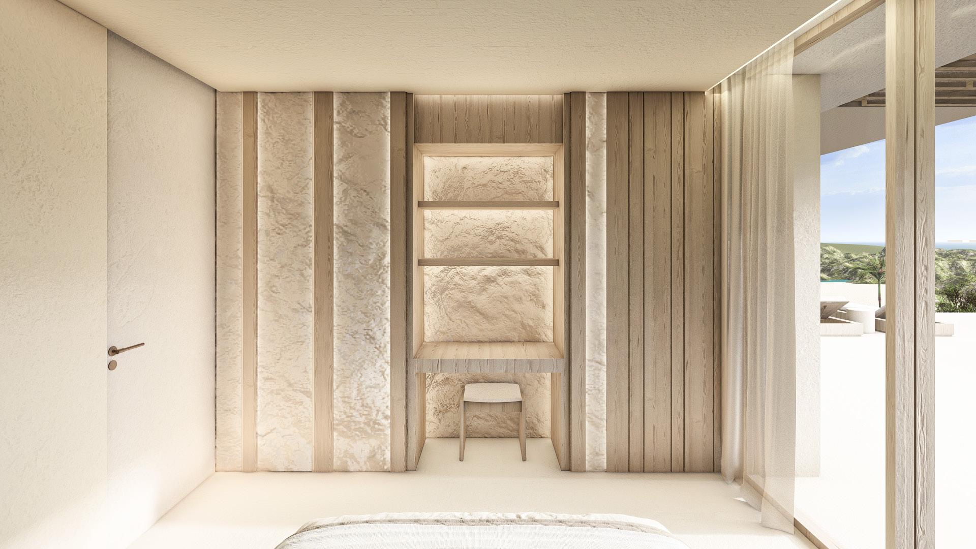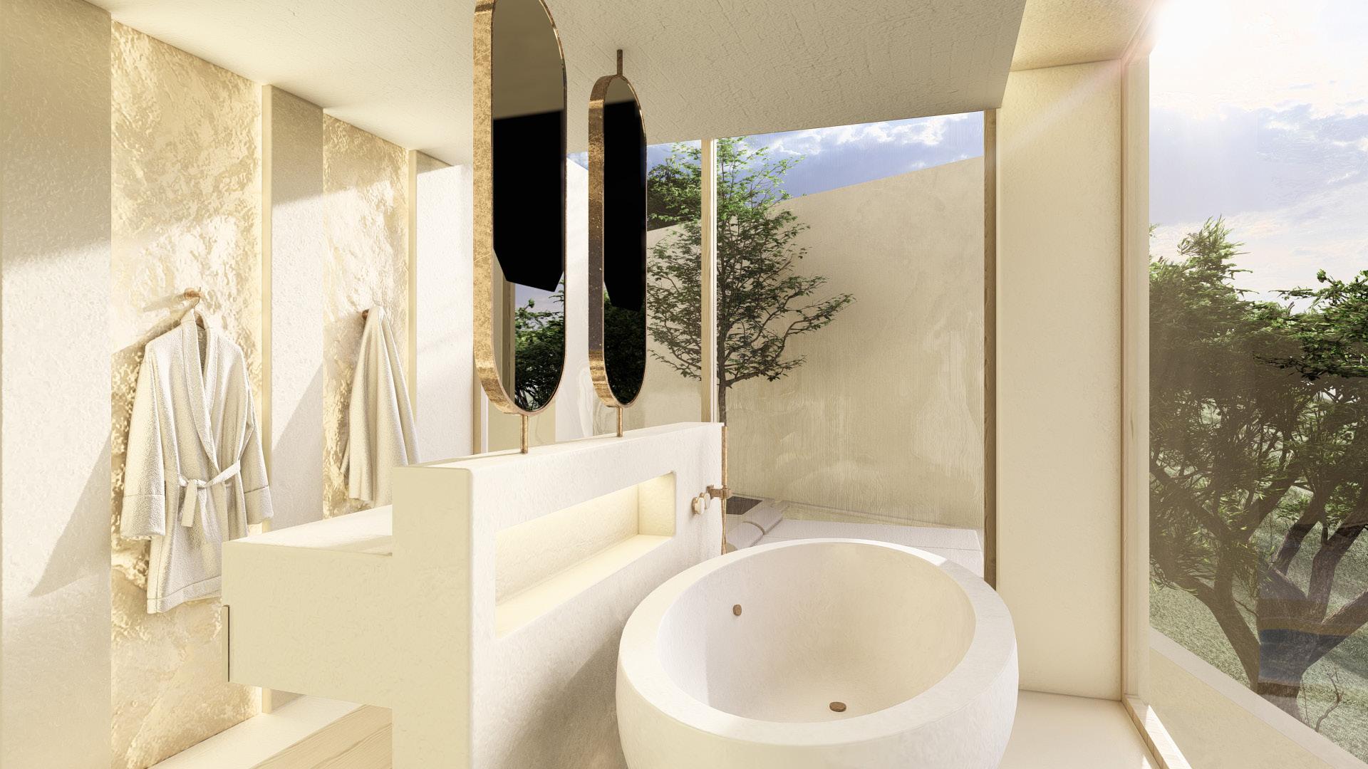 Two bedroom villa with open concept living areas. Minimal monotone design, with a touch of sophisticated elegance through golden details.