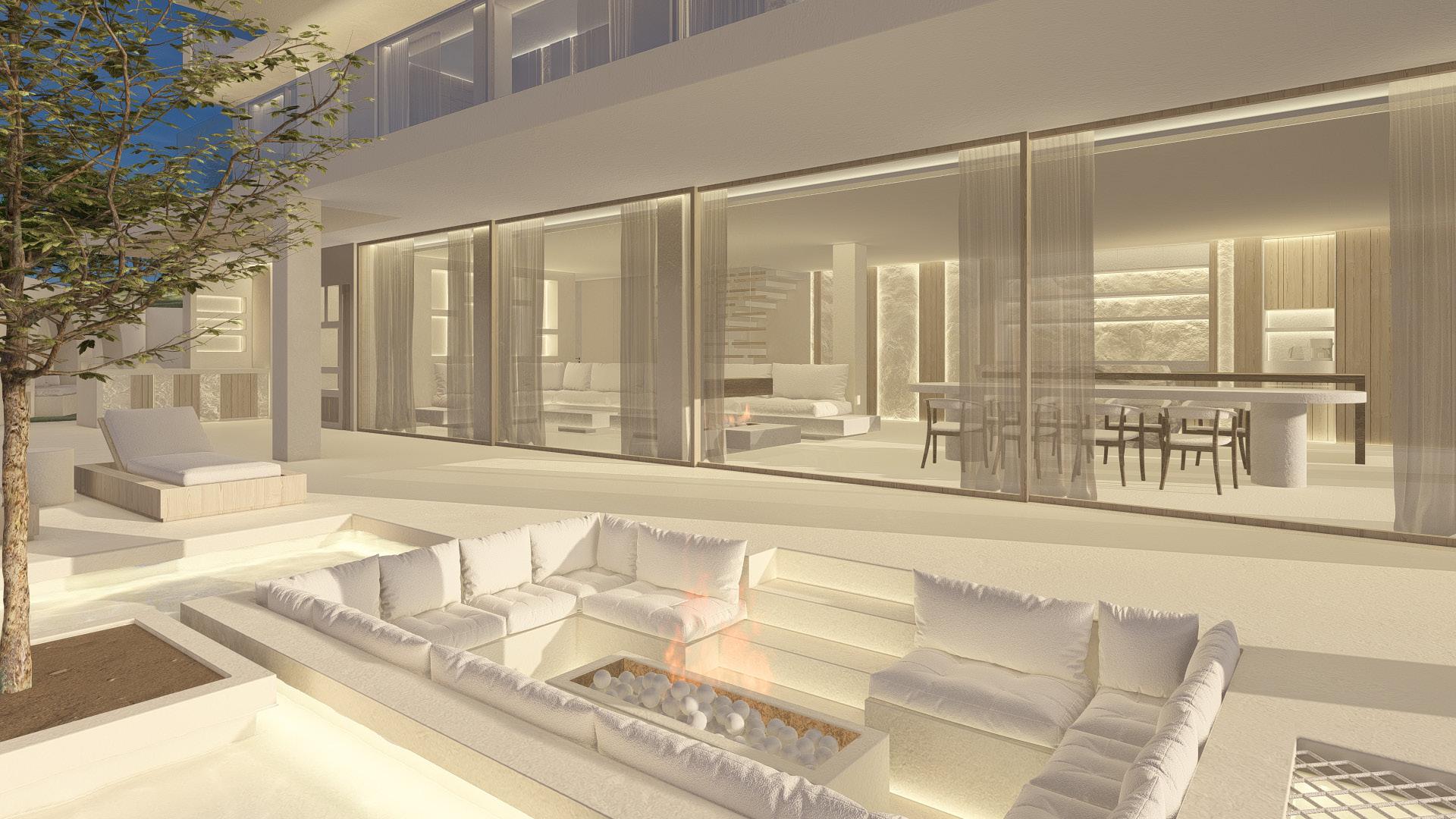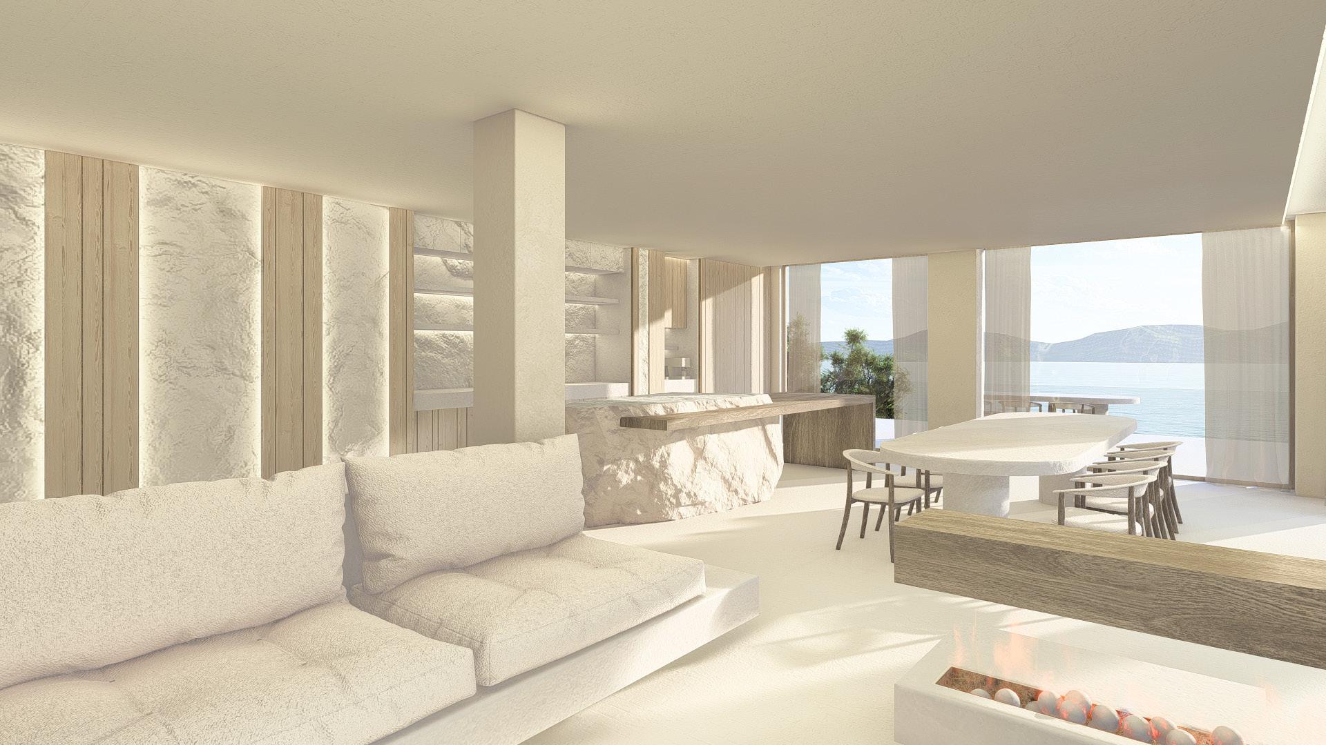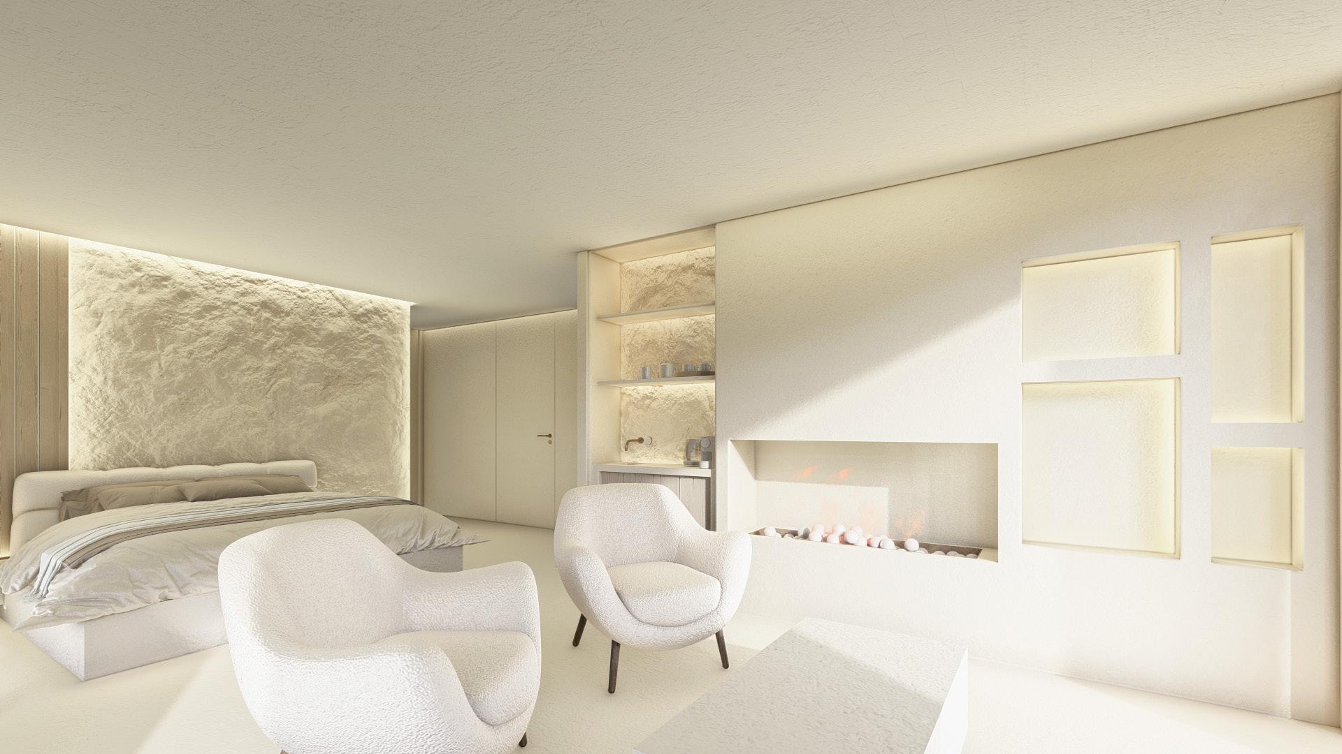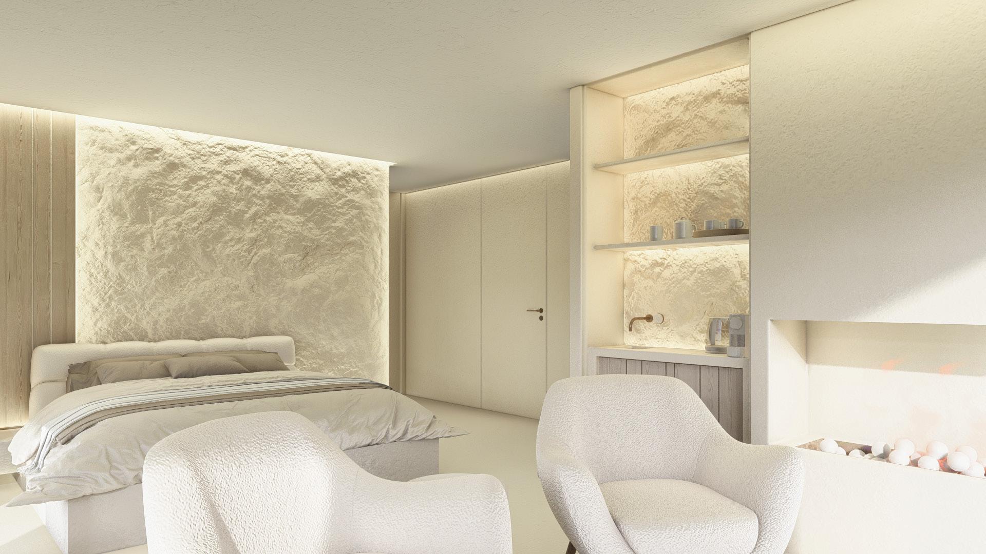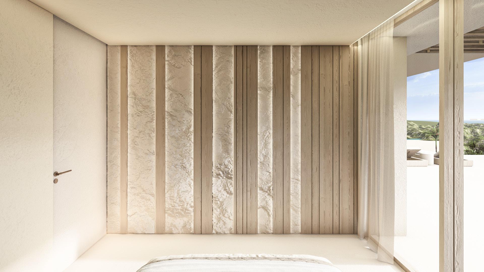 Two bedroom villa with open concept living areas. Minimal monotone design, with a touch of sophisticated elegance through golden details.